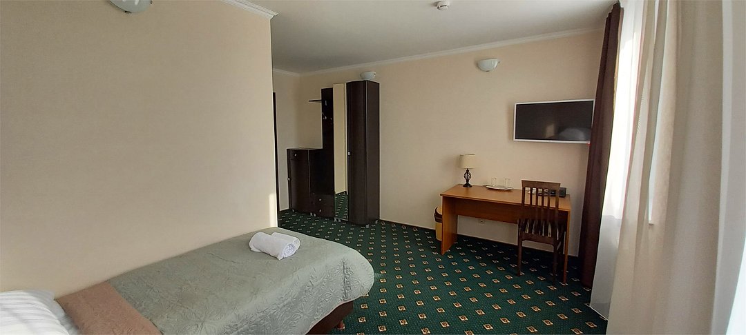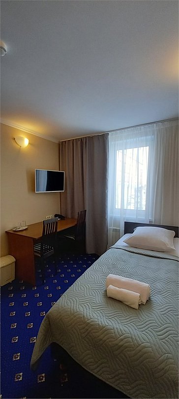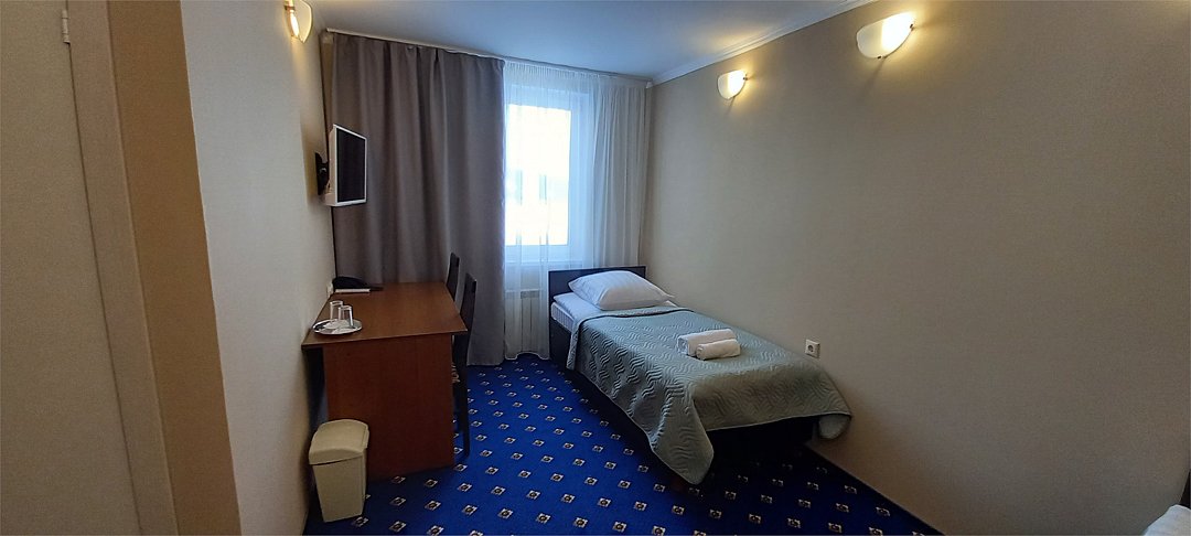 В одноместном номере с собственным санузлом, туалет, раковина, душевая кабина, халат, фен, набор полотенец, шампунь, гель для душа, мыло, зубной набор. Wi-Fi, телефон, ЖК-телевизор, стол, стул, шкаф, прикроватная тумбочка, зеркало, односпальная кровать(900х2000)Услуги и удобства