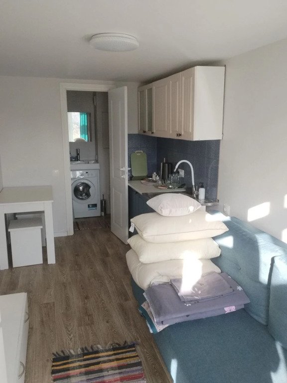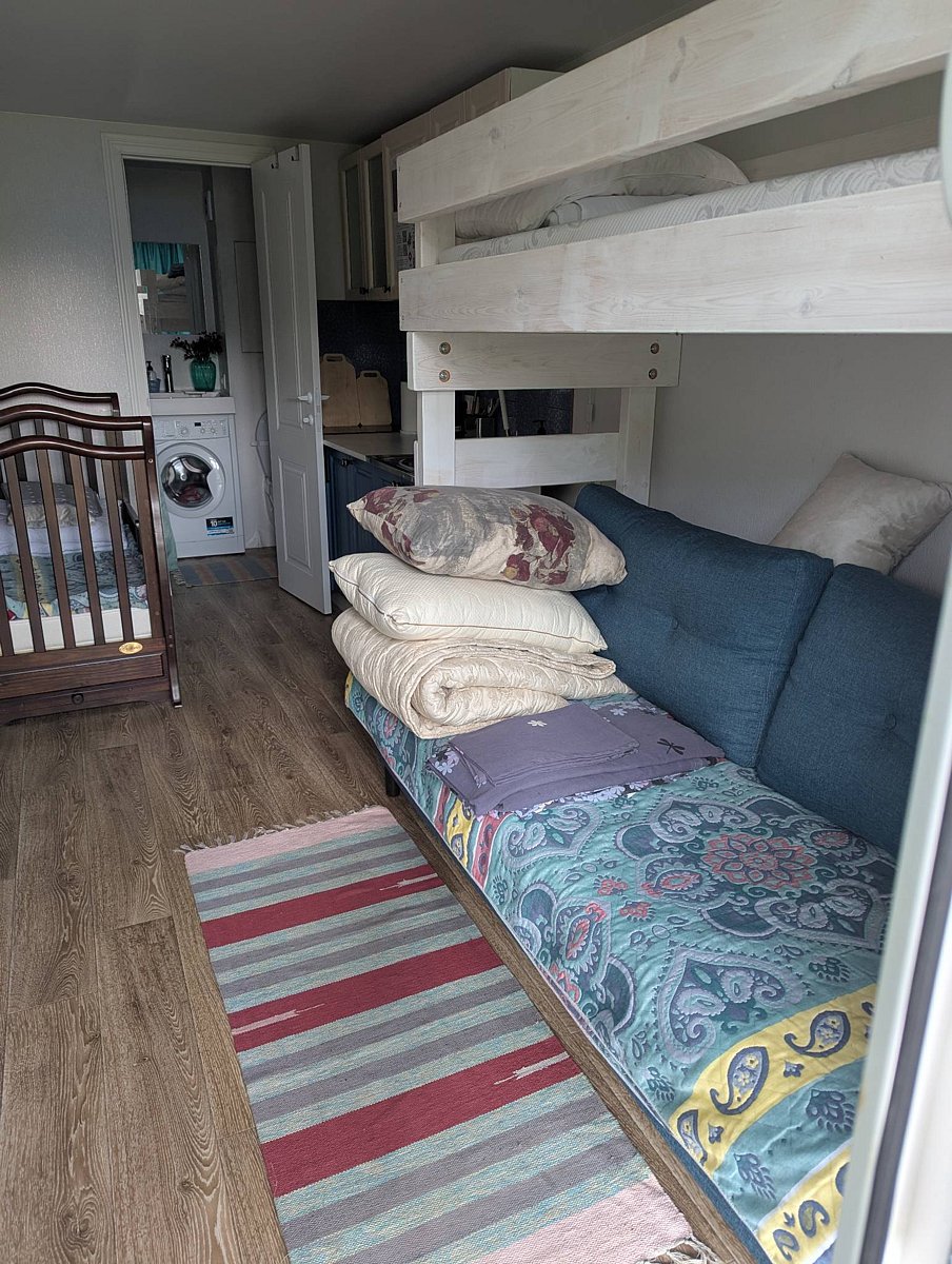 Двухместный домик оснащен всем необходимым для комфортного проживания. Имеется комфортабельное спальное место со свежим постельным комплектом, предоставленным для гостей, тумбочка для размещения личных вещей. Есть собственная ванная комната с душем, стиральной машиной и средствами гигиены.
