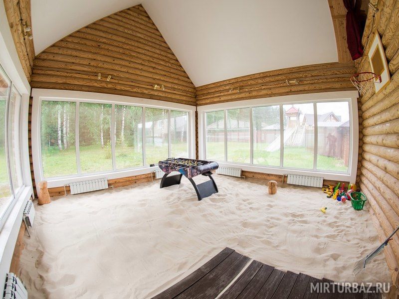 В банном комплексе «Пляж» имеется расслабляющая зона в виде отдельной комнаты с панорамным остеклением, с видом на потрясающей красоты деревья, и полом, вместо которого находится беленький песочек, на котором находится игра "настольный футбол".