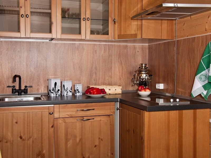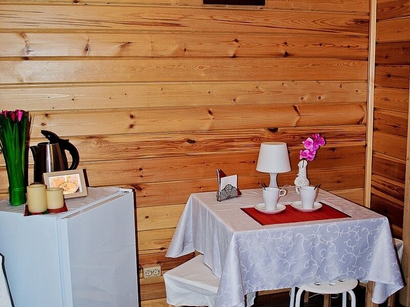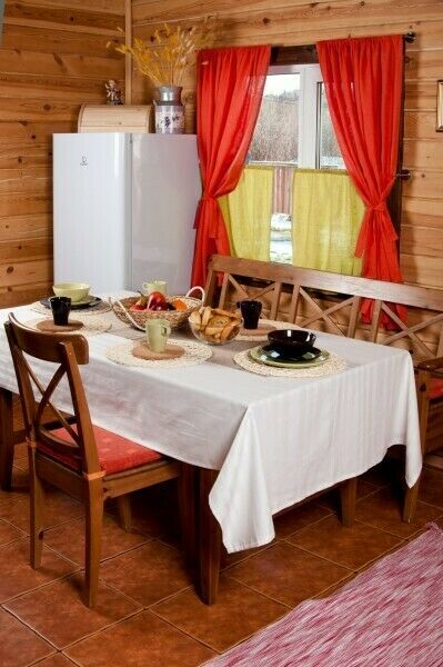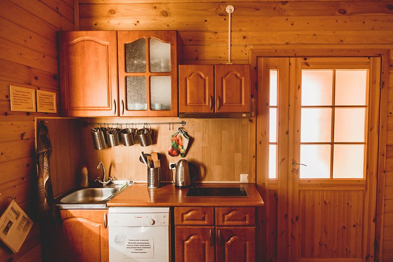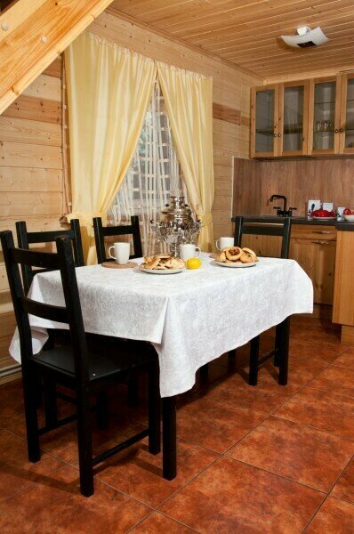 Уют домика «Кантри» начинается с его «сердца» — кухни, где за обеденным столом с аппетитной выпечкой может собраться дружная семья или теплая компания друзей. Плита, холодильник, электрочайник, посудомоечная машина, микроволновая печь, комплекты посуды - на кухне вы найдете все, что может понадобиться для приготовления и принятия пищи.