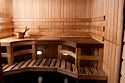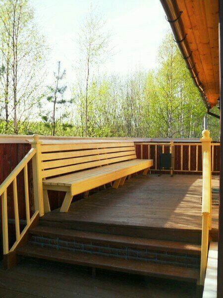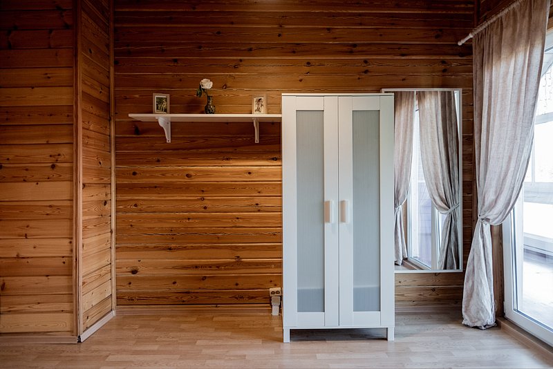 - прихожая, кухня, спальня с двуспальной и детской кроватями, гостиная, санузел, душевая с сауной (дровяная и электрическая), крытая терраса с печью-барбекю.