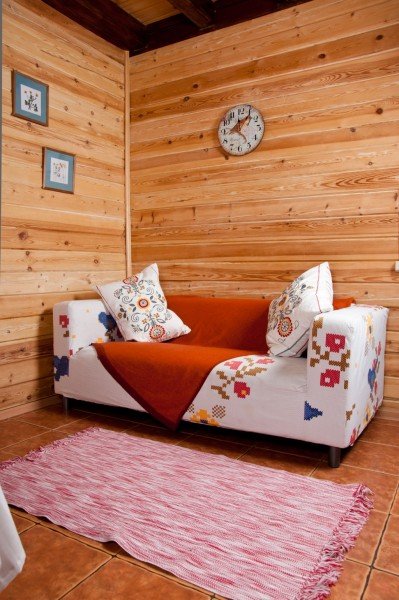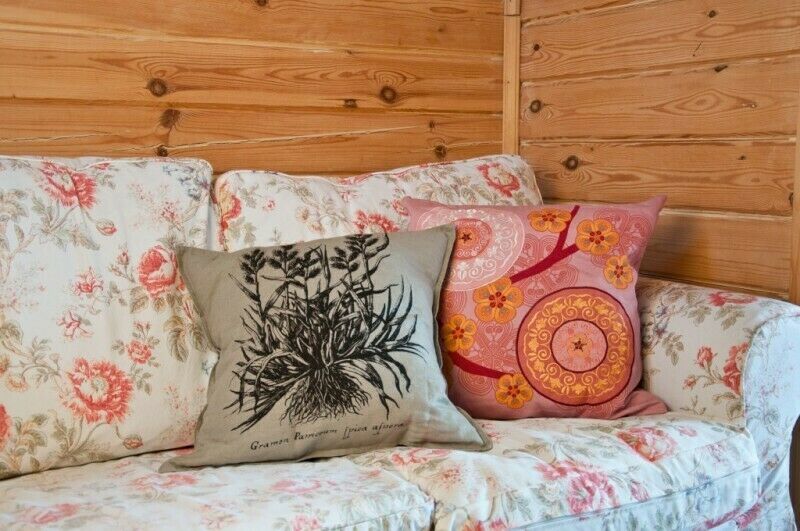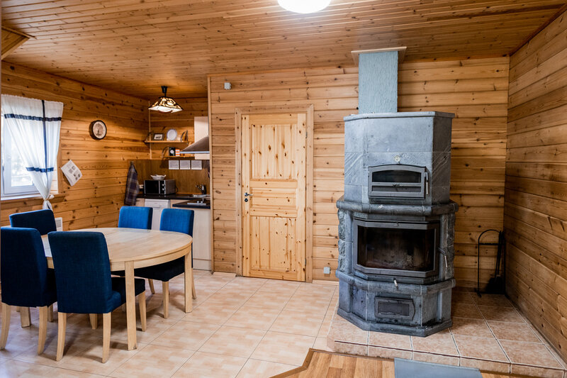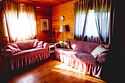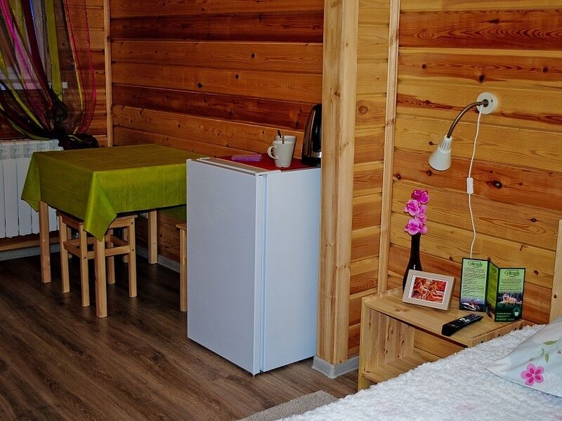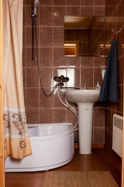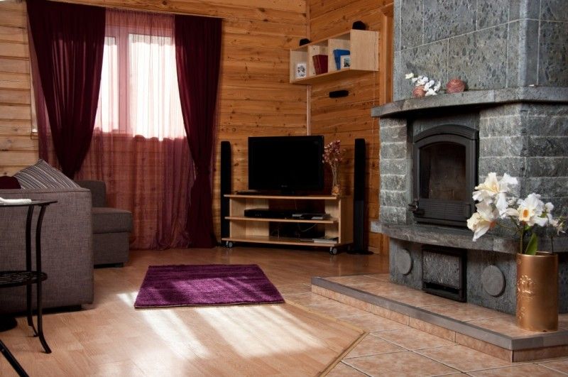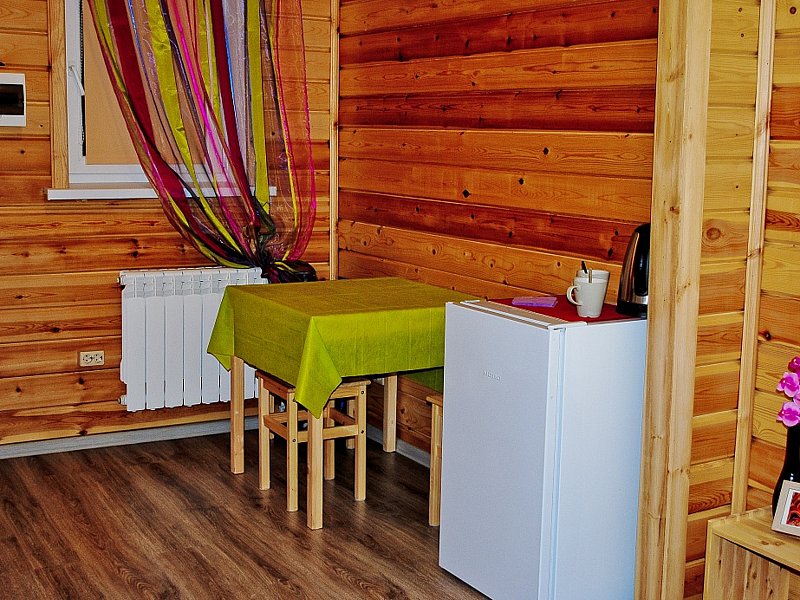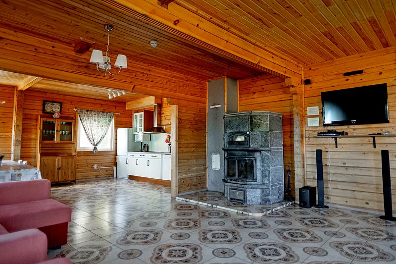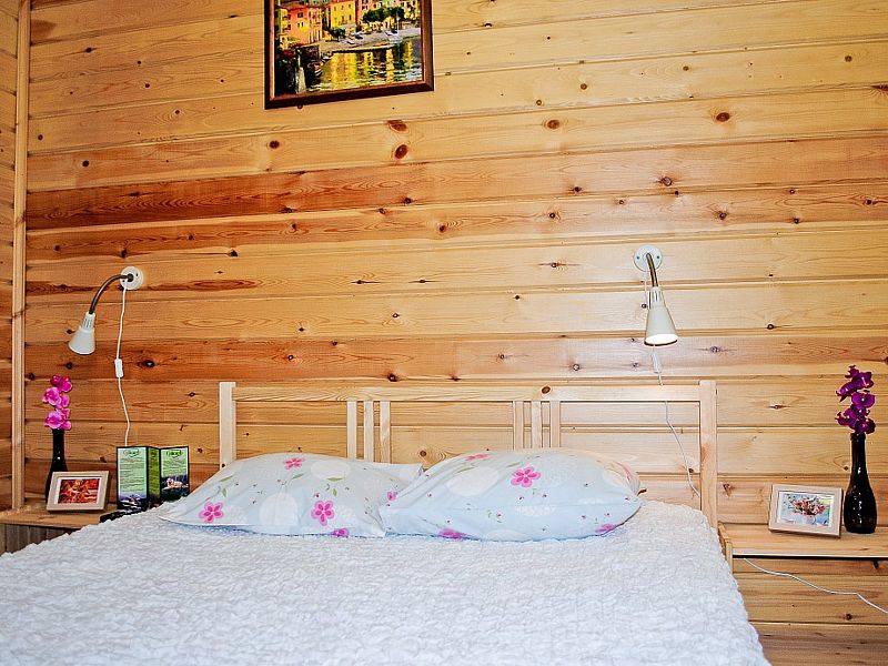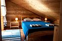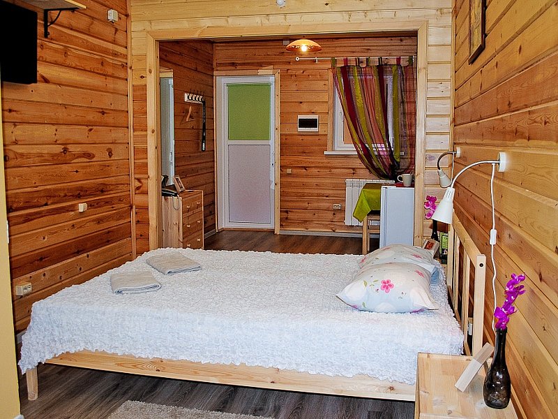 - спальня с двуспальной кроватью, две прихожих, санузел, совмещенные сауна и душевая, большая гостиная, совмещенная с кухней. Спутниковое ТВ, домашний кинотеатр, DVD, большой камин.