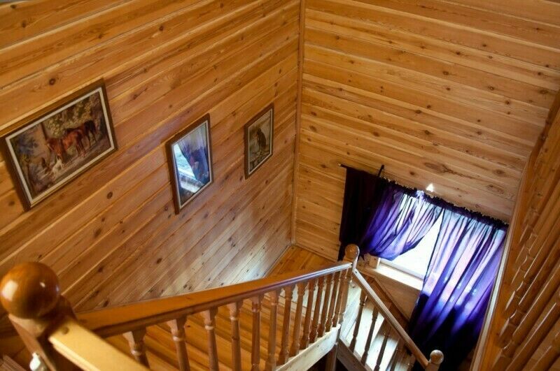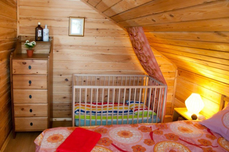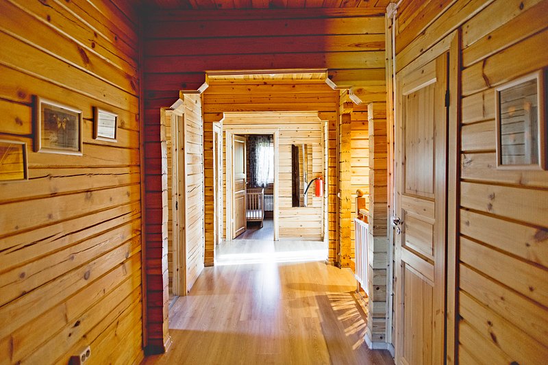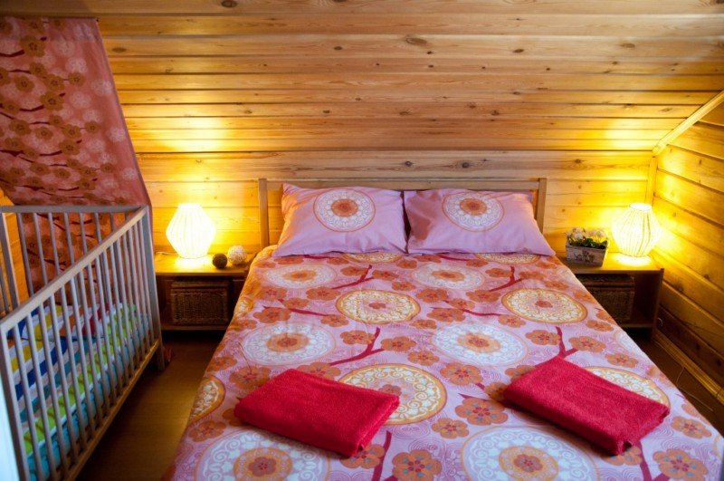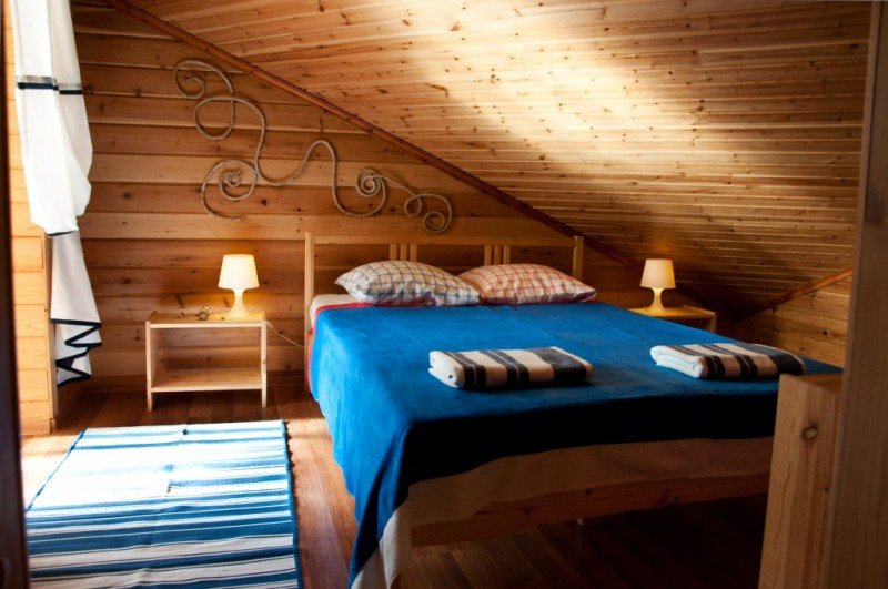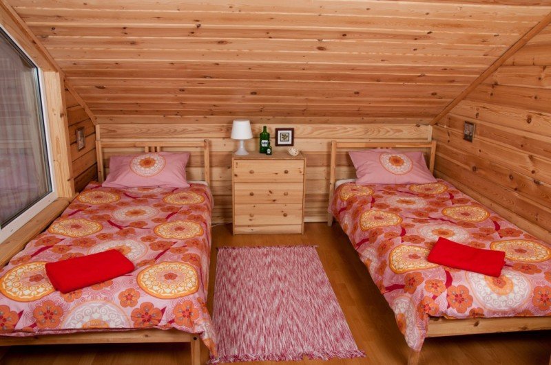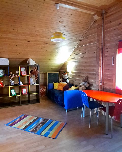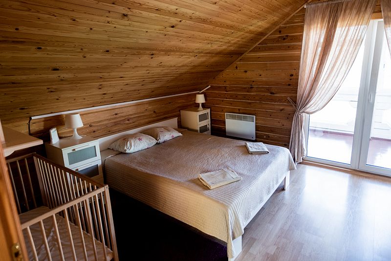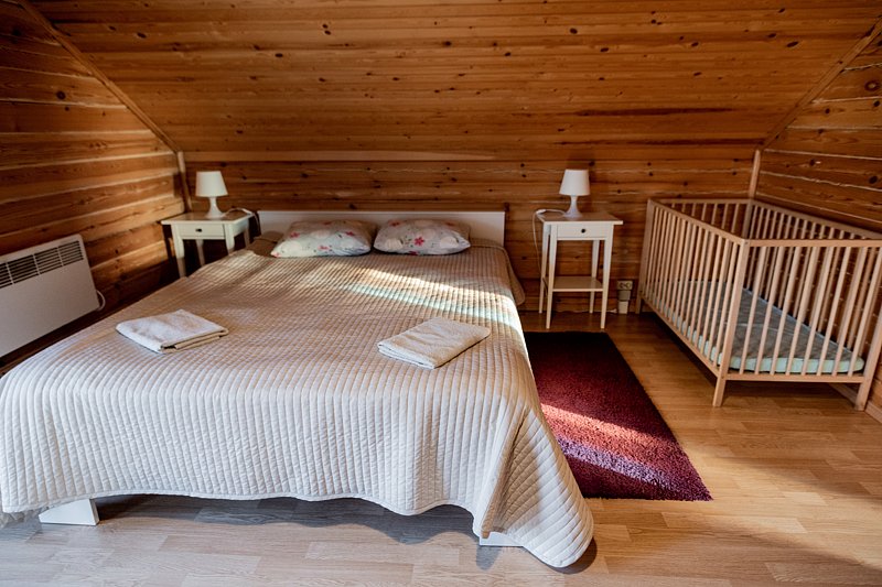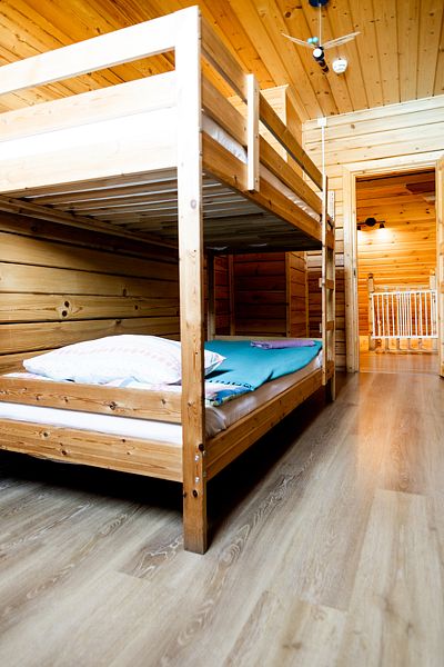 На первом этаже также расположены просторный холл, туалетная комната и сауна, а на втором этаже — спальные комнаты. В первой спальне вы найдете двуспальную кровать для родителей и детскую кроватку для малыша, во второй смогут устроиться сразу пять человек, третья спальня — это детский уголок с двухъярусной кроватью и четвертая спальня предназначена для четверых человек.