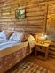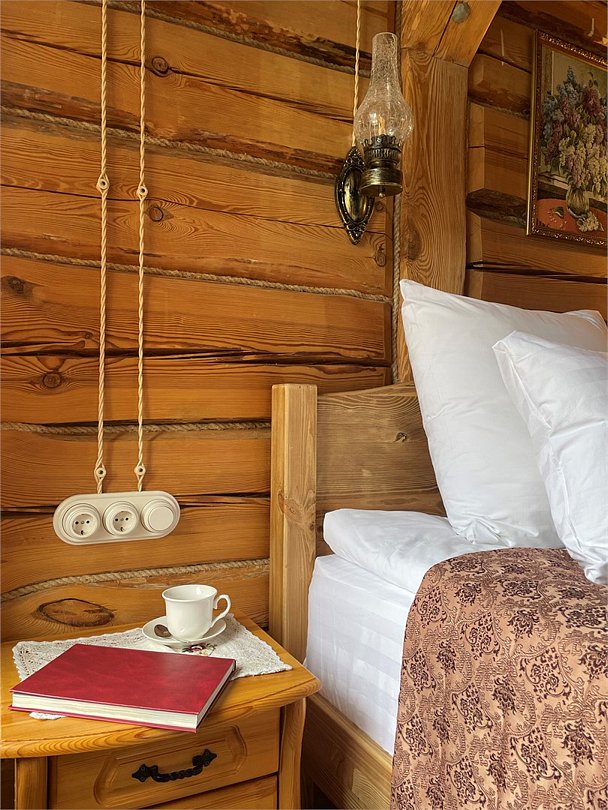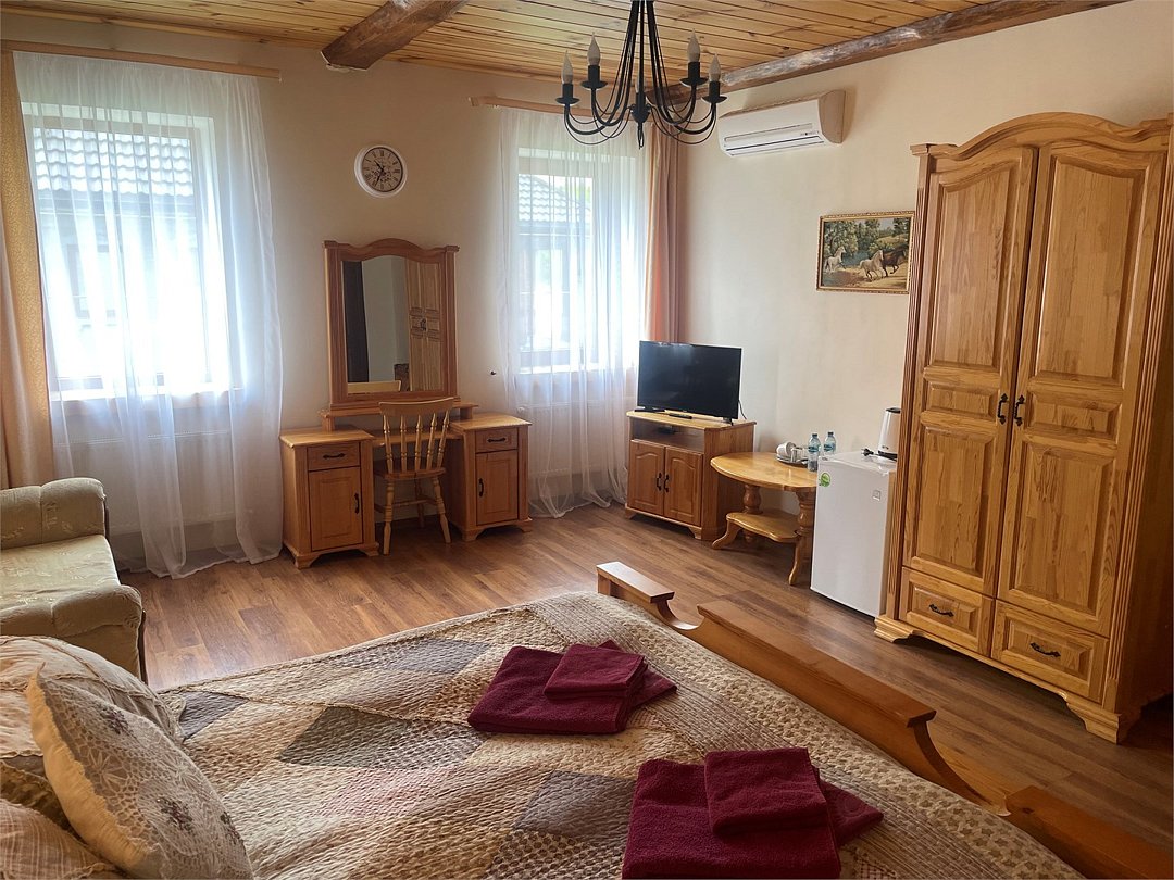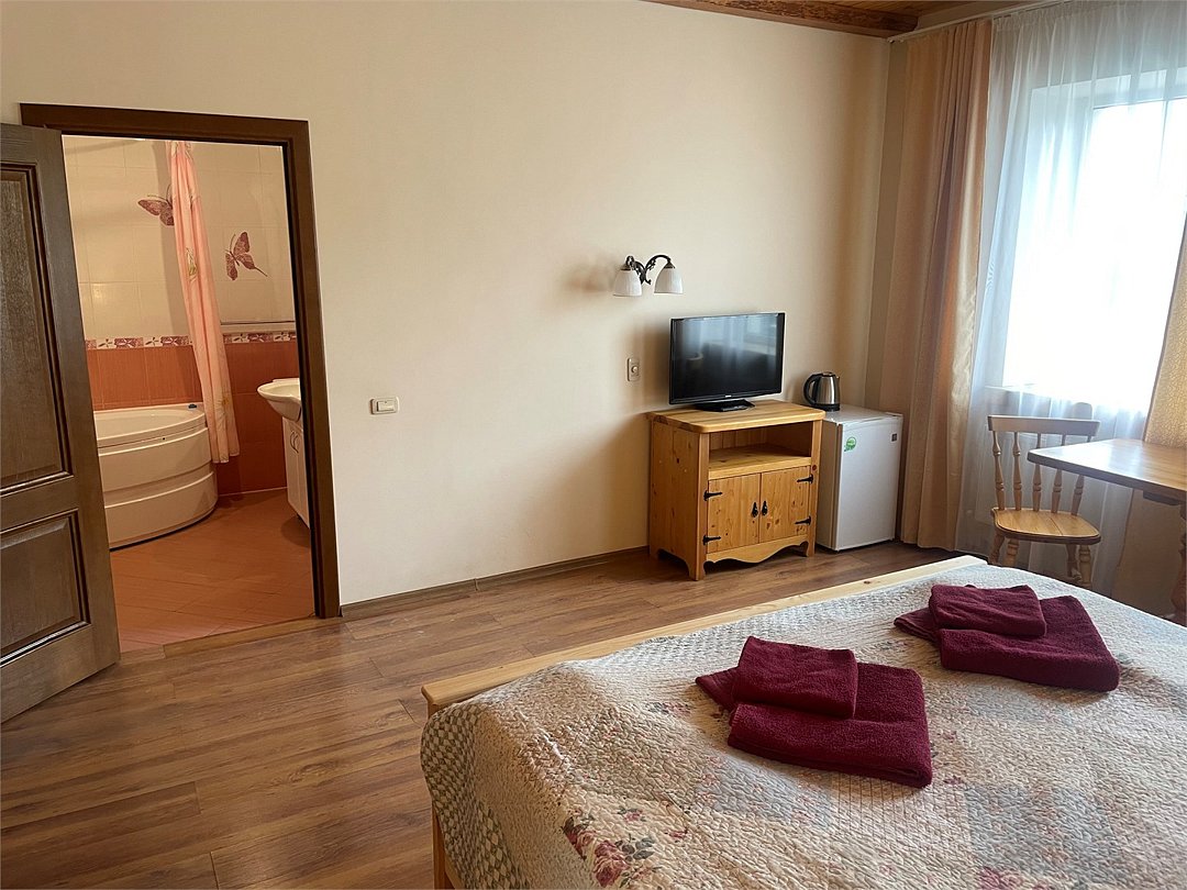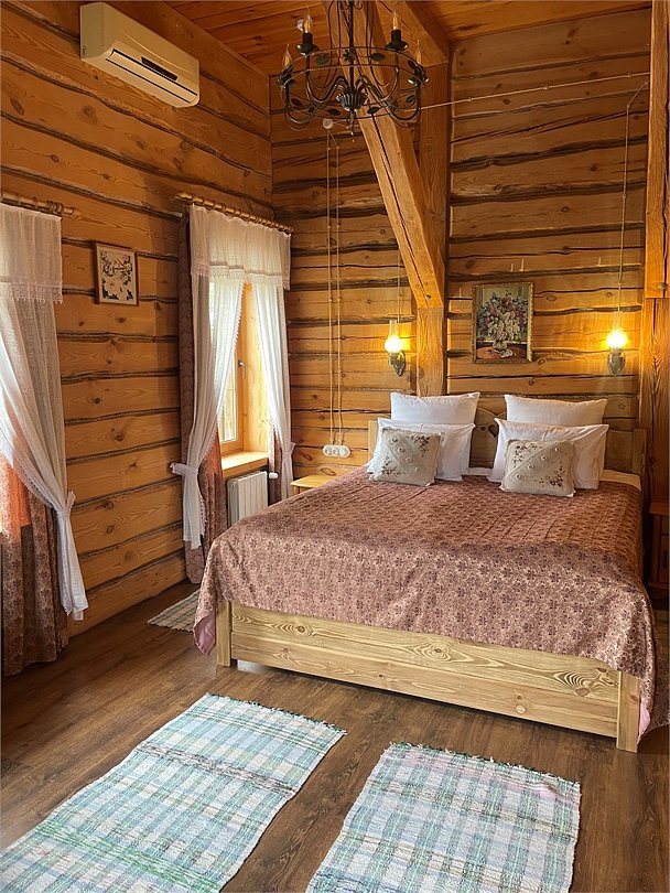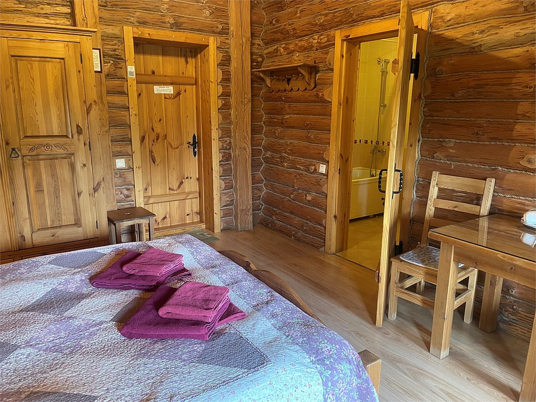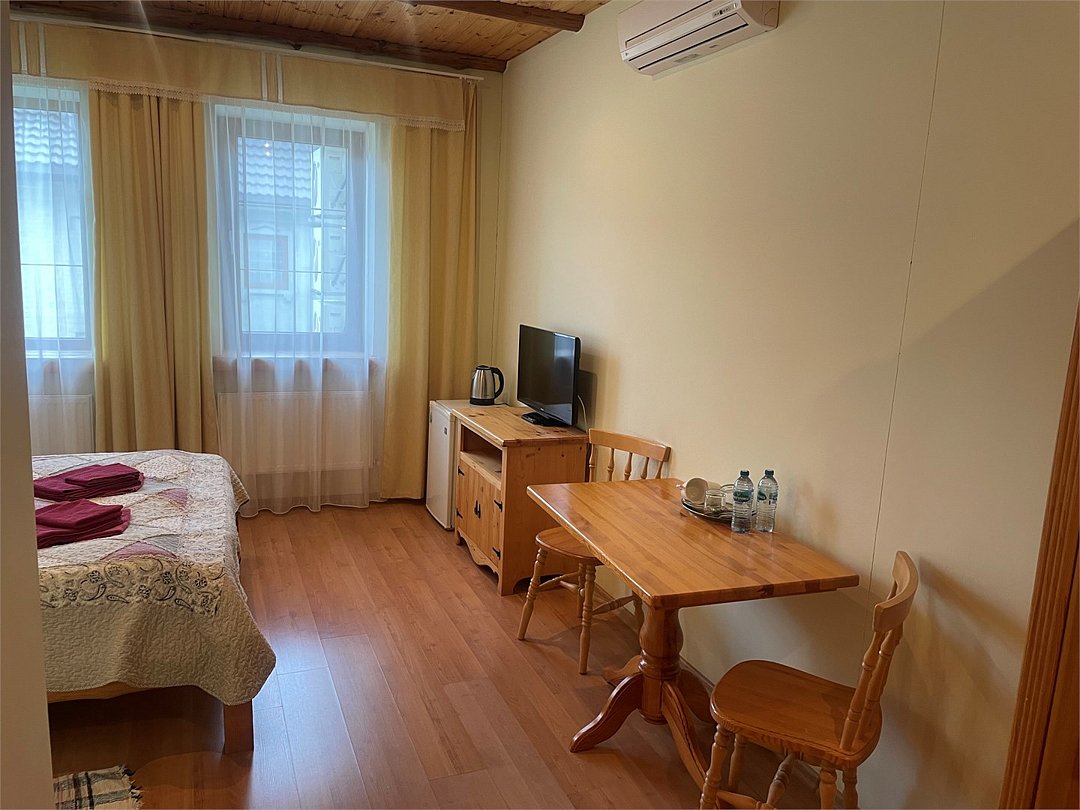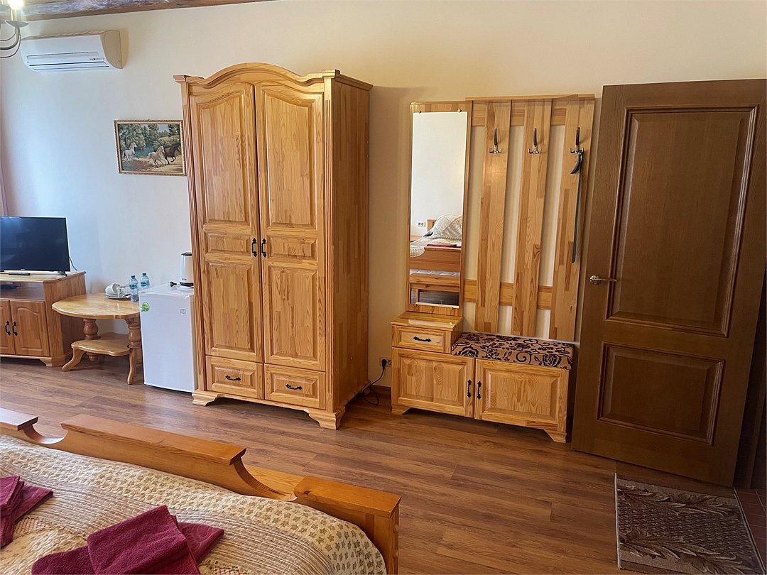 Просторный номер, площадью 27м2, расположен на втором этаже здания. Комната полностью выполнена из дерева. Стены из рубленной сосны, потолок из досок с деревянными массивными фермами, несущими нагрузку от массивной черепичной крыши. Аутентичная мебель ручной работы, состарена и покрыта воском. Из мебели в комнате имеется кровать, шириной 1.6 метра, две прикроватные тумбочки, стол с двумя стульями, тумба, платяной шкаф, вешалка для одежды, зеркало. Диванчик ручной работы трансформируется в большое спальное место, шириной 1.1 метра. и длиной 2 метра. Из техники: холодильник, телевизор с плоским экраном, чайник с чайными принадлежностями и кондиционер. В номере собственная туалетная комната с ванной и современной сантехникой. В ней Вы найдете фен и туалетно-косметические принадлежности.Услуги и удобства
