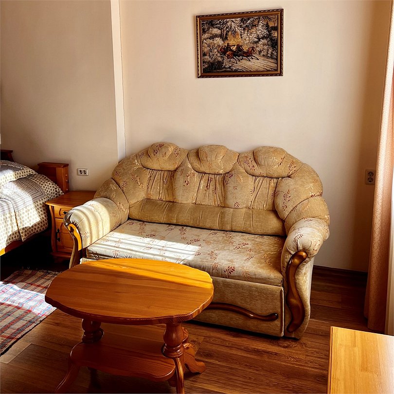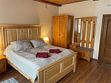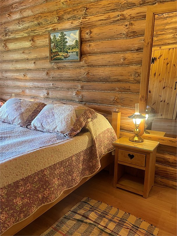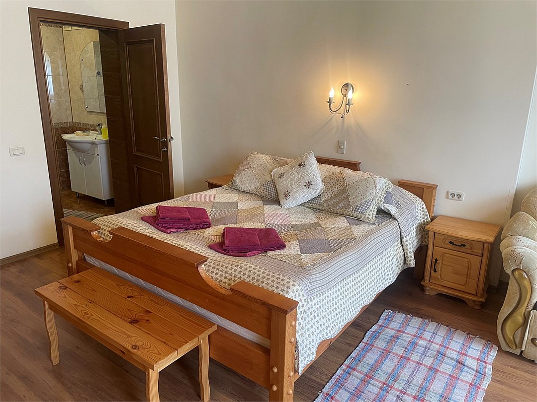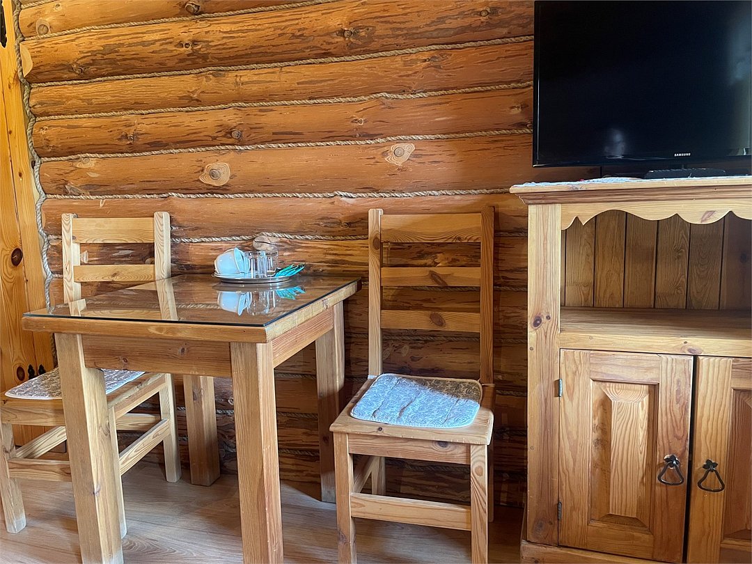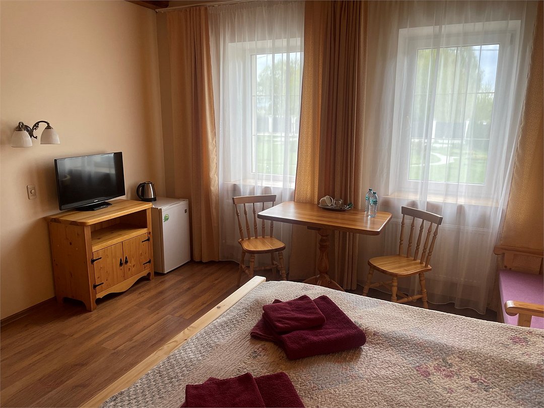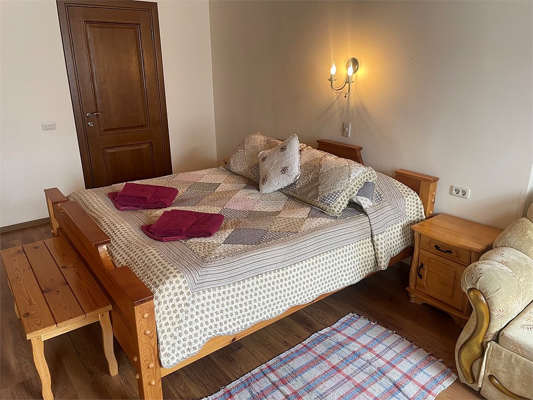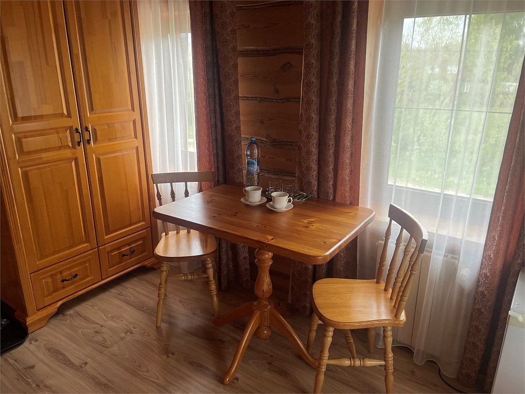 Просторный номер, площадью 27м2, расположен на втором этаже здания. Комната полностью выполнена из дерева. Стены из рубленной сосны, потолок из досок с деревянными массивными фермами, несущими нагрузку от массивной черепичной крыши. Аутентичная мебель ручной работы, состарена и покрыта воском. Из мебели в комнате имеется кровать, шириной 1.6 метра, две прикроватные тумбочки, стол с двумя стульями, тумба, платяной шкаф, вешалка для одежды, зеркало. Диванчик ручной работы трансформируется в большое спальное место, шириной 1.1 метра. и длиной 2 метра. Из техники: холодильник, телевизор с плоским экраном, чайник с чайными принадлежностями и кондиционер. В номере собственная туалетная комната с ванной и современной сантехникой. В ней Вы найдете фен и туалетно-косметические принадлежности.Услуги и удобства