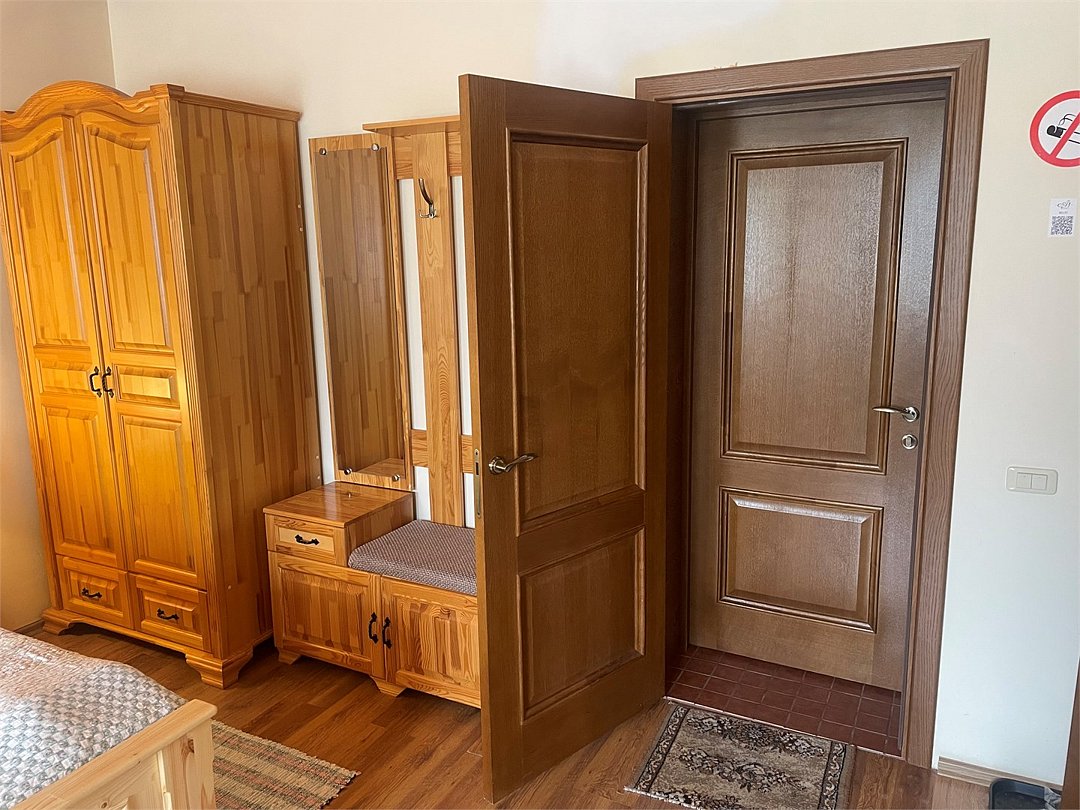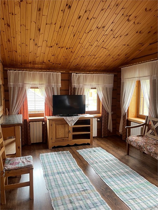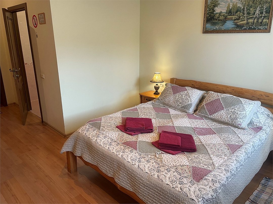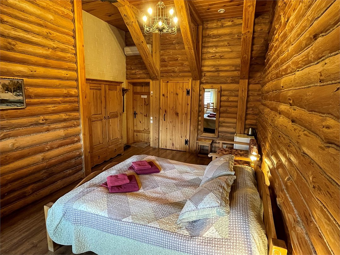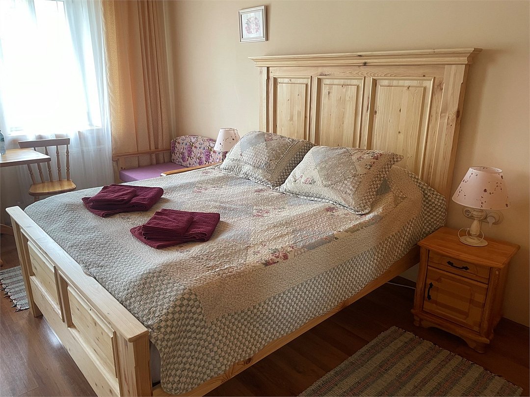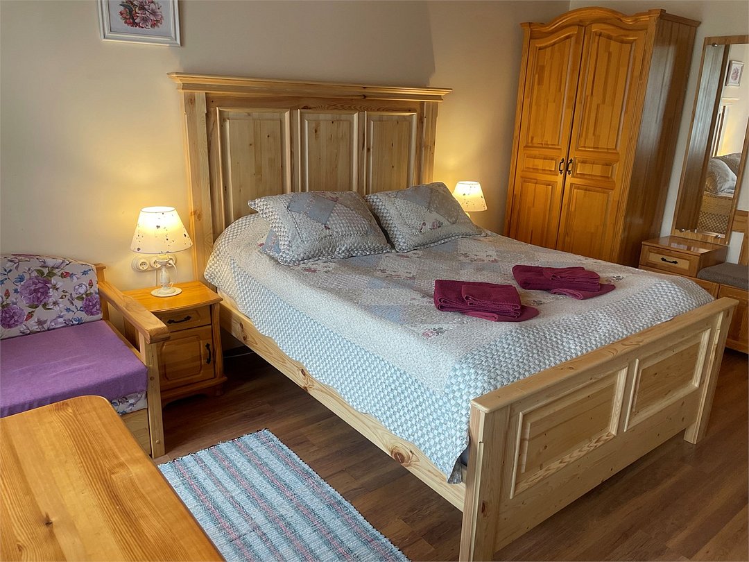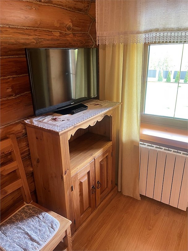 Просторный номер, площадью 27м2, расположен на втором этаже здания. Комната полностью выполнена из дерева. Стены из рубленной сосны, потолок из досок с деревянными массивными фермами, несущими нагрузку от массивной черепичной крыши. Аутентичная мебель ручной работы, состарена и покрыта воском. Из мебели в комнате имеется кровать, шириной 1.6 метра, две прикроватные тумбочки, стол с двумя стульями, тумба, платяной шкаф, вешалка для одежды, зеркало. Диванчик ручной работы трансформируется в большое спальное место, шириной 1.1 метра. и длиной 2 метра. Из техники: холодильник, телевизор с плоским экраном, чайник с чайными принадлежностями и кондиционер. В номере собственная туалетная комната с ванной и современной сантехникой. В ней Вы найдете фен и туалетно-косметические принадлежности.Услуги и удобства