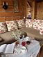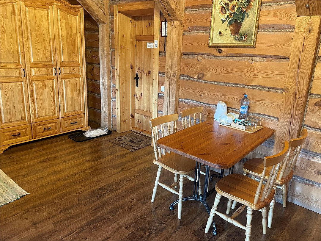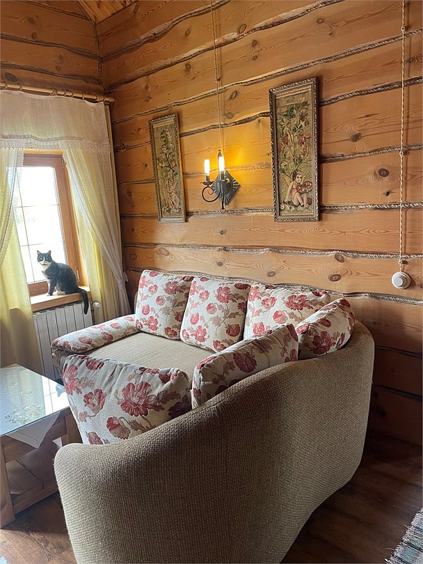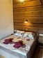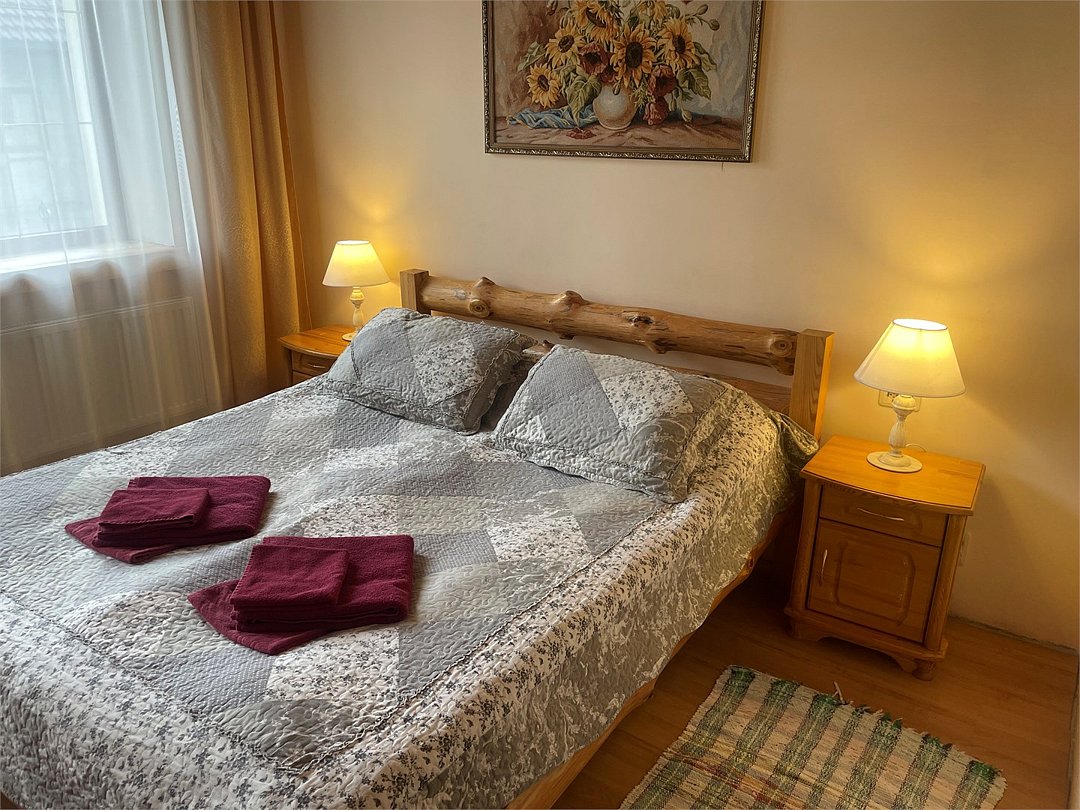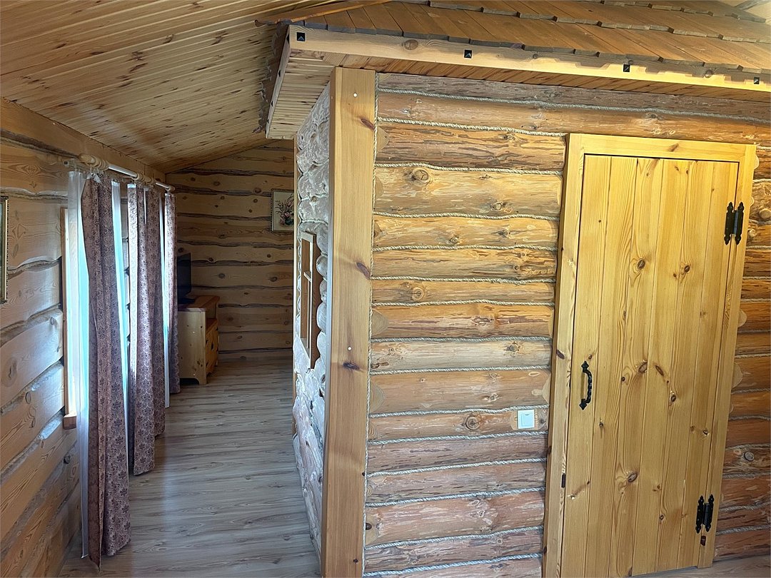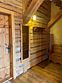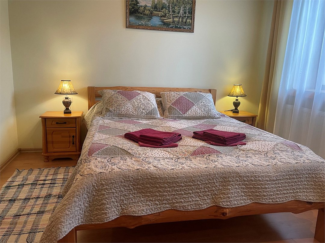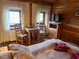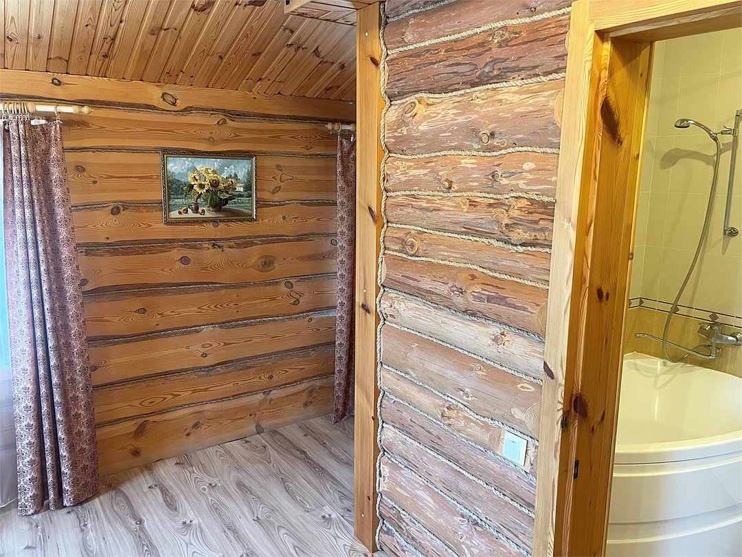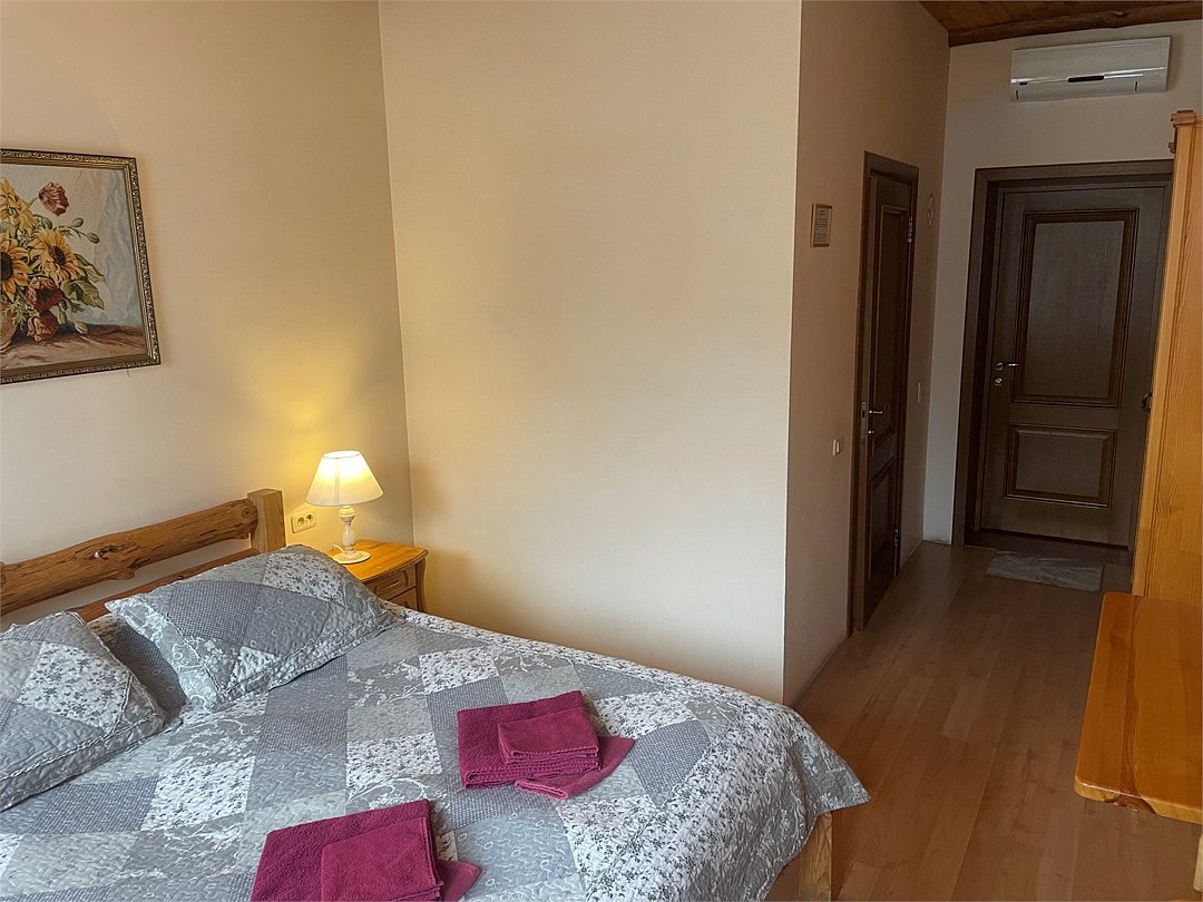 Просторный номер, площадью 27м2, расположен на втором этаже здания. Комната полностью выполнена из дерева. Стены из рубленной сосны, потолок из досок с деревянными массивными фермами, несущими нагрузку от массивной черепичной крыши. Аутентичная мебель ручной работы, состарена и покрыта воском. Из мебели в комнате имеется кровать, шириной 1.6 метра, две прикроватные тумбочки, стол с двумя стульями, тумба, платяной шкаф, вешалка для одежды, зеркало. Диванчик ручной работы трансформируется в большое спальное место, шириной 1.1 метра. и длиной 2 метра. Из техники: холодильник, телевизор с плоским экраном, чайник с чайными принадлежностями и кондиционер. В номере собственная туалетная комната с ванной и современной сантехникой. В ней Вы найдете фен и туалетно-косметические принадлежности.Услуги и удобства