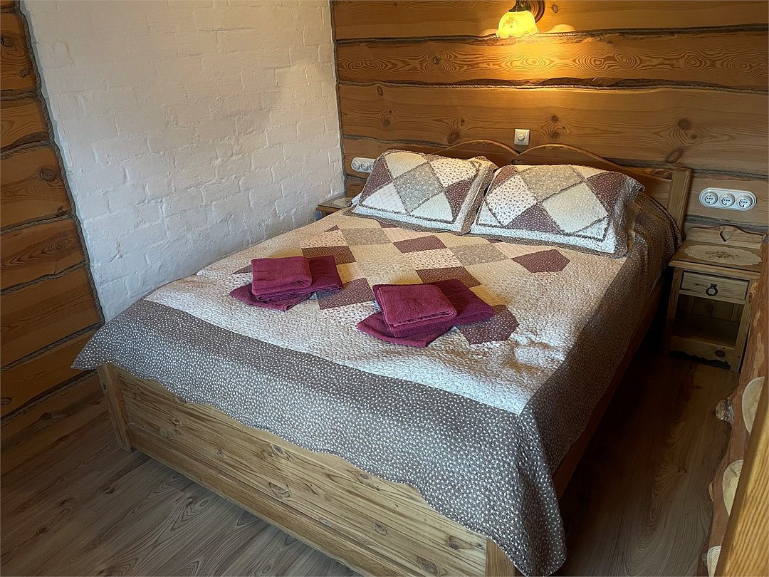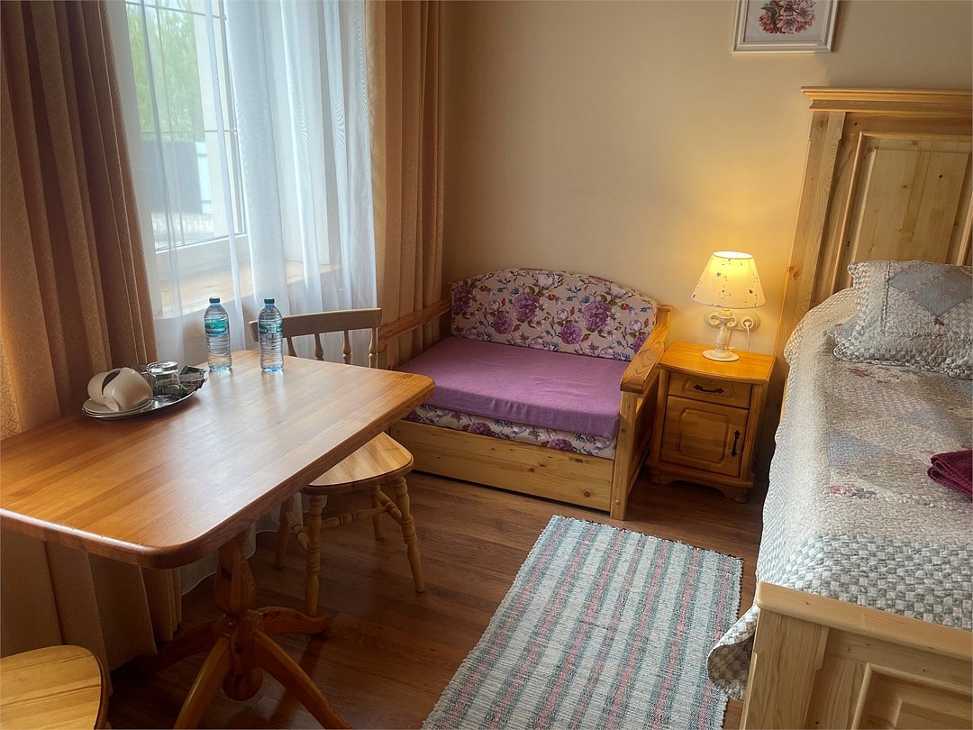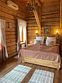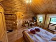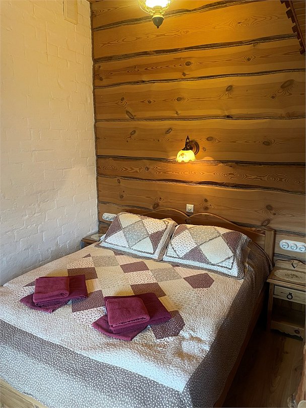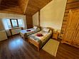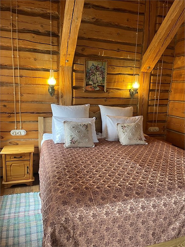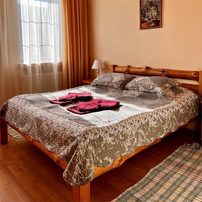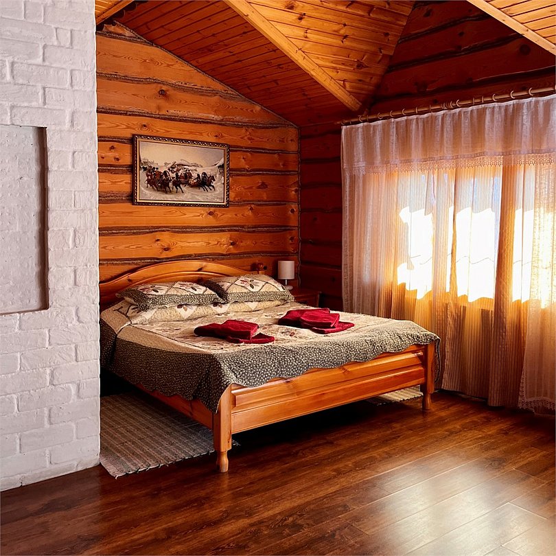 Просторный номер, находится на втором этаже здания. Стены отделаны бревнами, которые сочетаются с массивными потолочными балками, несущими нагрузку от массивной черепичной кровли. Собственный санузел, стилизованный под рубленный домик с черепичной крышей, внутри которого находится ванна и современная сантехника. В номере Вы найдете деревянную мебель ручной работы. Комната рассчитана на троих гостей, имеется одна большая двуспальная кровать шириной 1.6 метра и односпальная кровать. Так же есть раскладной диванчик, который можно трансформировать в дополнительное место.Услуги и удобства