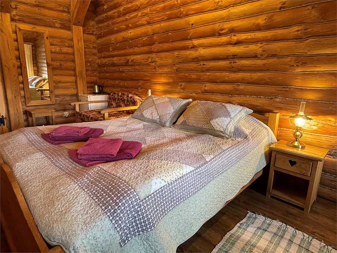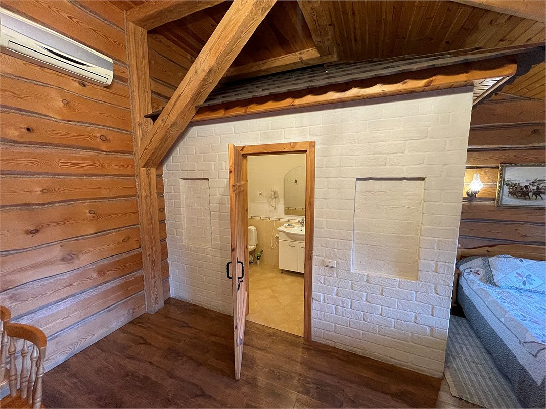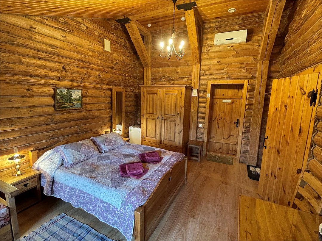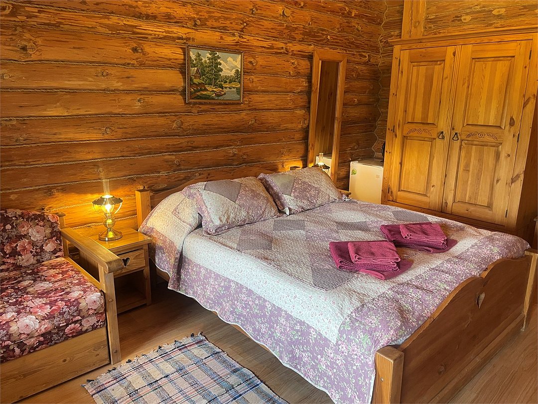 Просторный номер, находится на втором этаже здания. Стены отделаны бревнами, которые сочетаются с массивными потолочными балками, несущими нагрузку от массивной черепичной кровли. Собственный санузел, стилизованный под рубленный домик с черепичной крышей, внутри которого находится ванна и современная сантехника. В номере Вы найдете деревянную мебель ручной работы. Комната рассчитана на троих гостей, имеется одна большая двуспальная кровать шириной 1.6 метра и односпальная кровать. Так же есть раскладной диванчик, который можно трансформировать в дополнительное место.Услуги и удобства