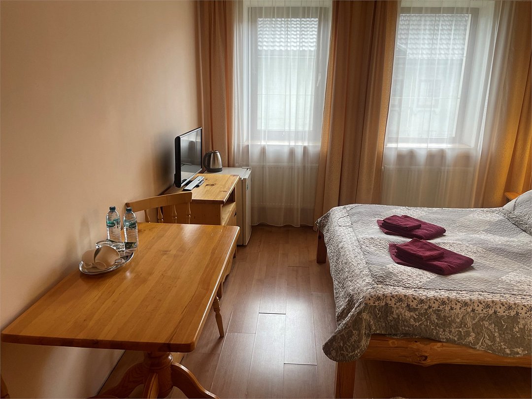 Стандартный номер, площадью 23 м2, расположен на первом этаже здания. Окна комнаты выходят во внутренний дворик отеля. Стены кирпичные, поштукатурены и покрашены экологичными акриловыми красками. На полу ламинированный паркет, потолки деревянные. Из мебели в комнате имеется платяной шкаф, кровать, две прикроватные тумбочки, стол с двумя стульями, тумба. Также имеется холодильник, телевизор с плоским экраном, чайник с чайными принадлежностями, кондиционер. В собственной туалетной комнате установлена душевая кабина, там же Вы найдете фен, и бесплатные туалетно-косметические принадлежности.