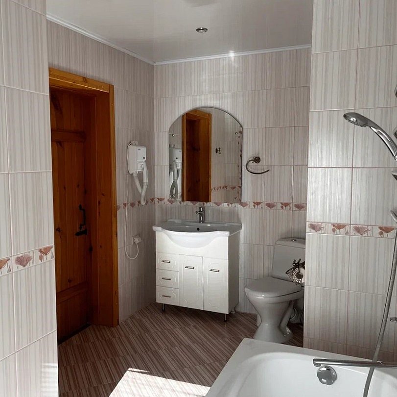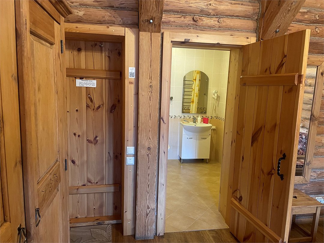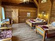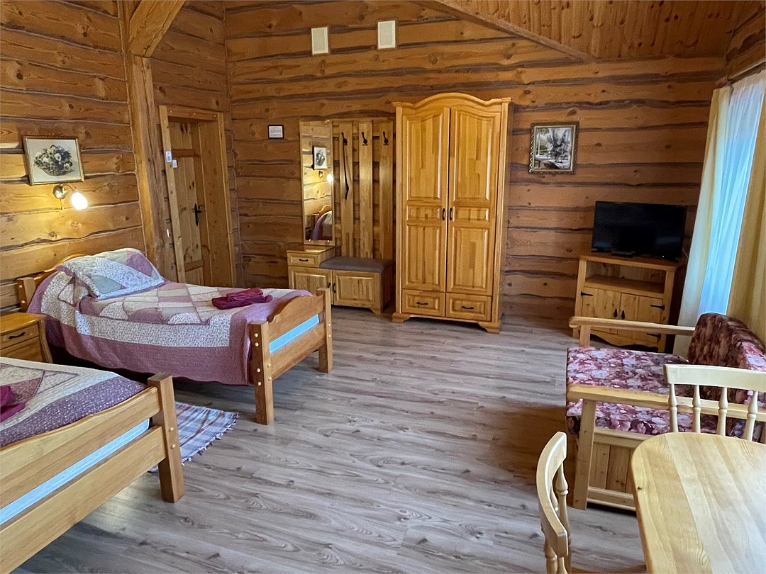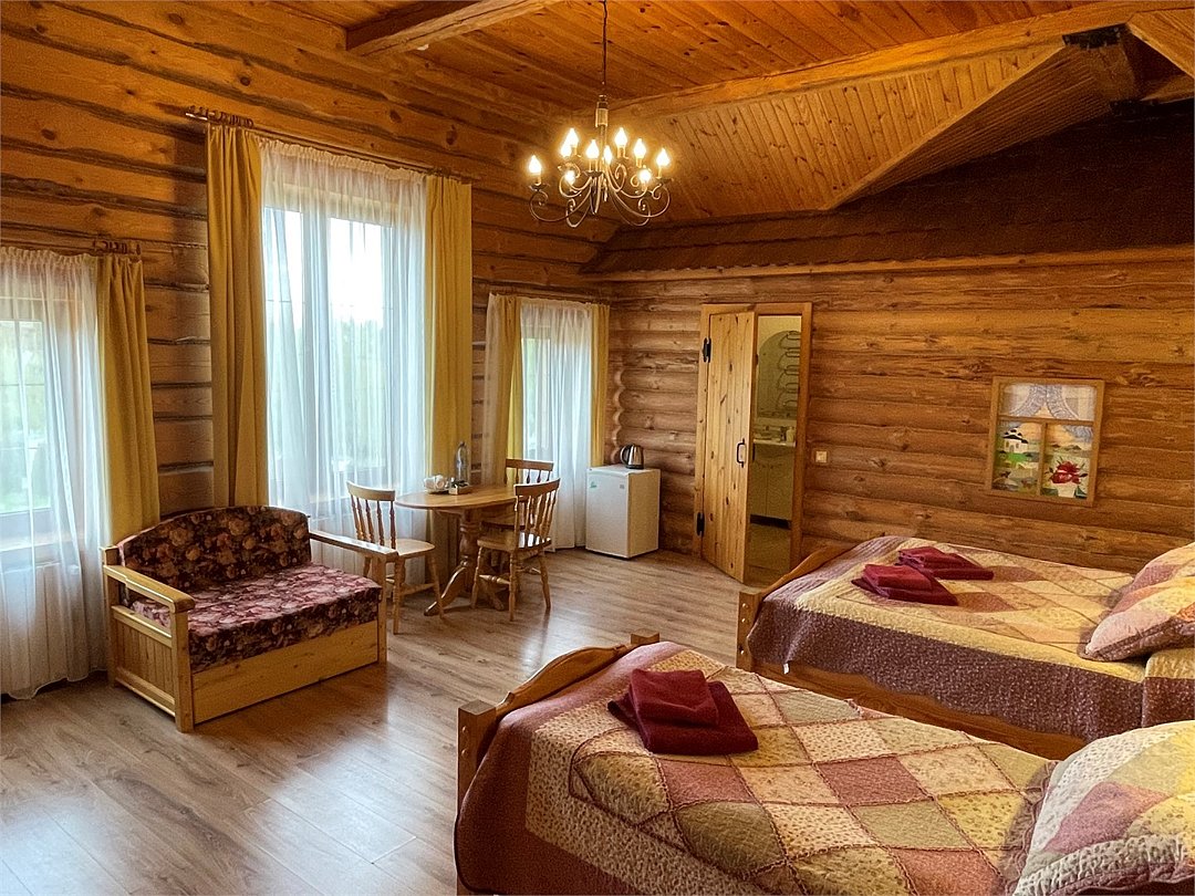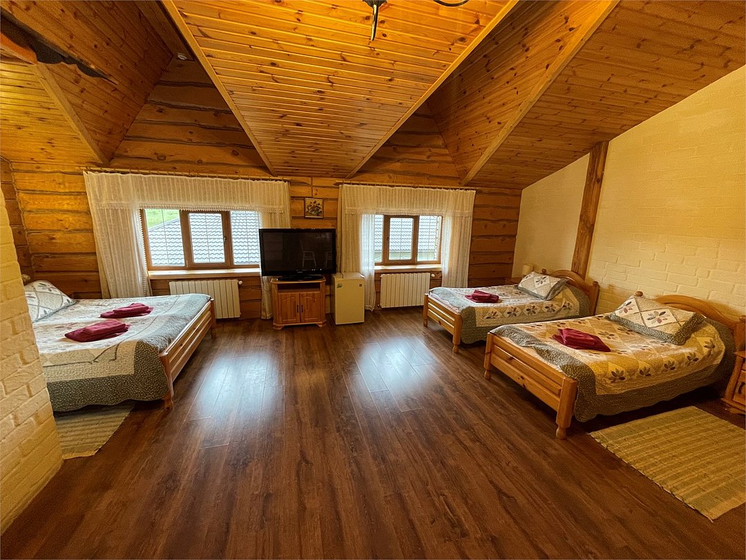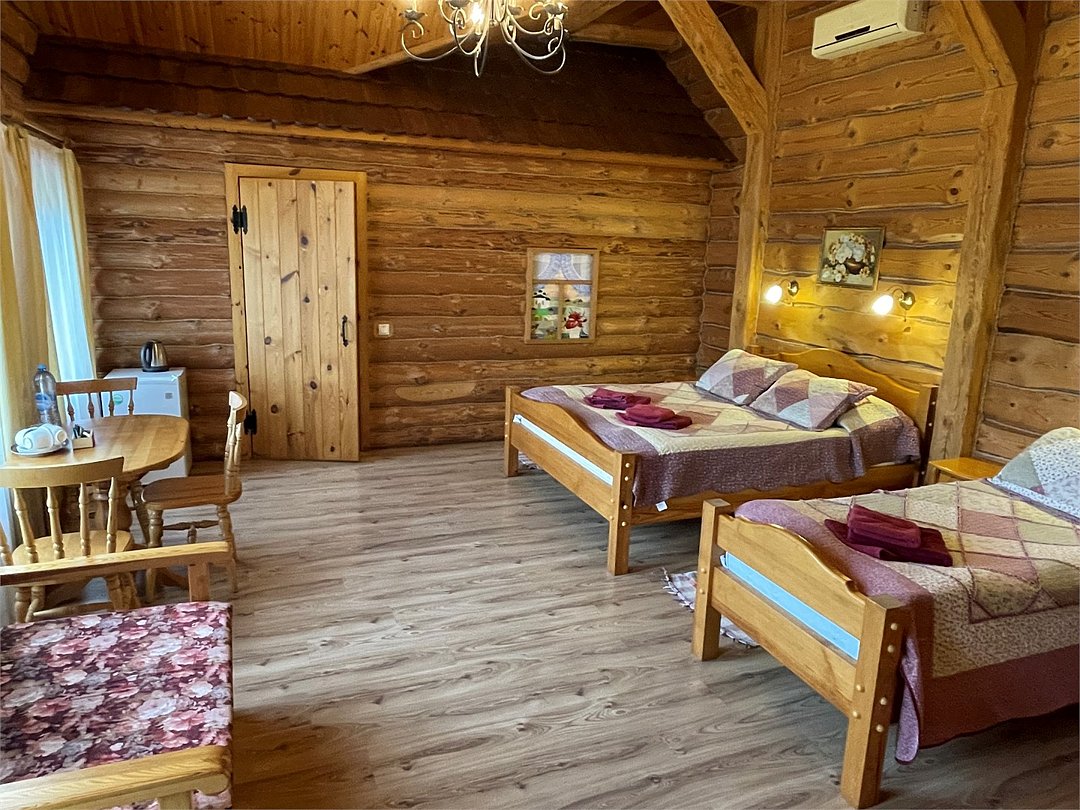 Большой семейный номер рассчитан на путешествия в кругу семьи. Он расположен на втором этаже здания. Деревянные стены в сочетании с высокими потолками и массивными деревянными балками, создают атмосферу деревенского дома. Номер однокомнатный с собственным санузлом, стилизованным под избу-мазанку с черепичной крышей. Деревянная мебель ручной работы создает уют и комфорт. В комнате имеется одна двуспальную кровать шириной 1.6 метра и две односпальные кровати, прикроватные тумбочки, стол со стульями, платяной шкаф и большой телевизор с плоским экраном.Услуги и удобства