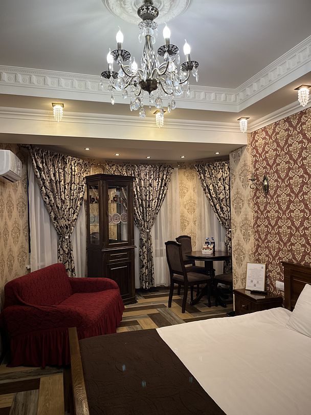 В номере санузел, оснащенный большой ванной и всеми необходимыми косметическими средствами, и небольшая гостиная зона, расположенная в эркере с тремя окнами. В номере установлена кровать размера King Size, имеется обеденная зона, холодильник с прохладительными напитками (включены в стоимость), ЖК Smart телевизор, высокоскоростной Wi-Fi интернет, кондиционер, небольшой диван, на котором может расположиться третий гость. Махровые халаты и тапочки включены в стоимость номера.