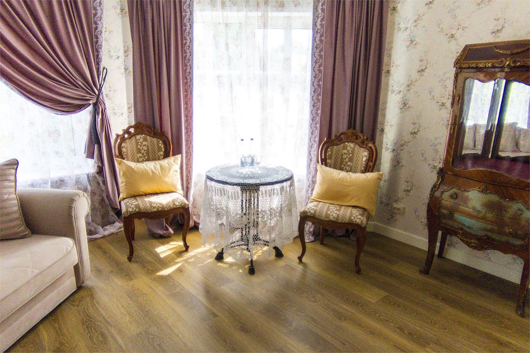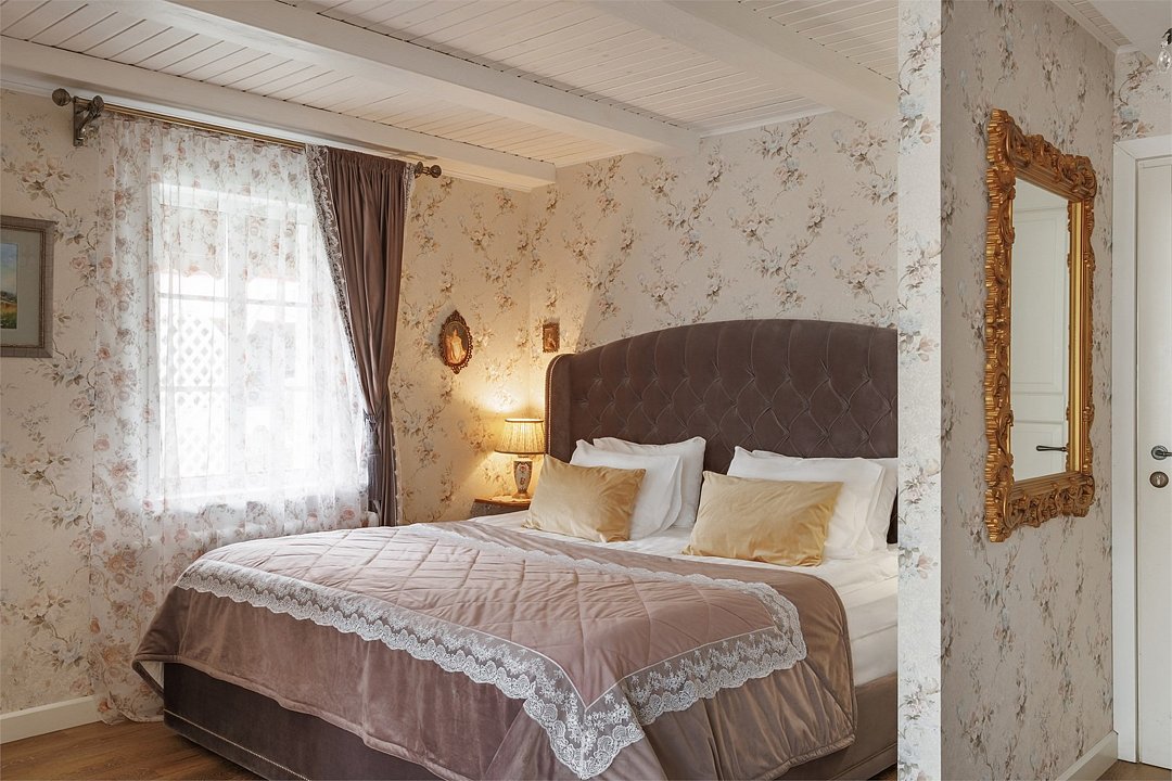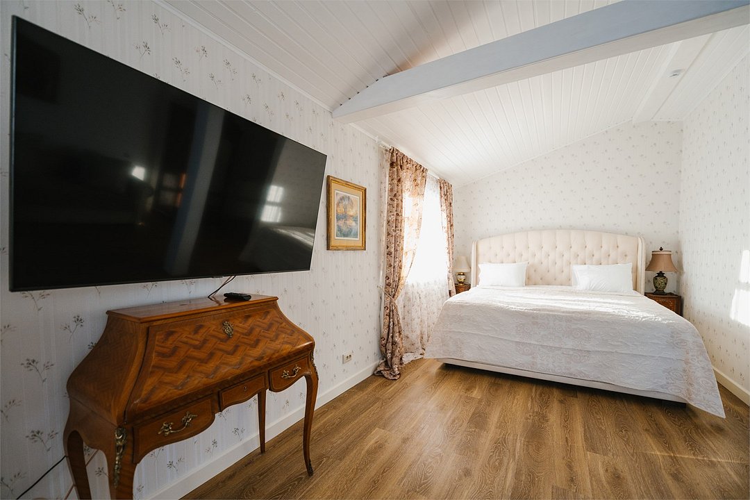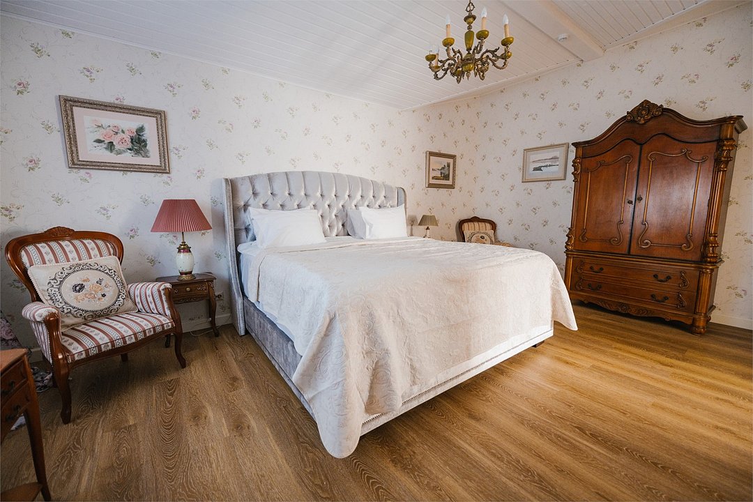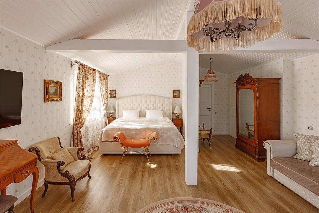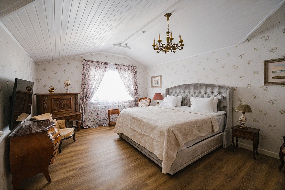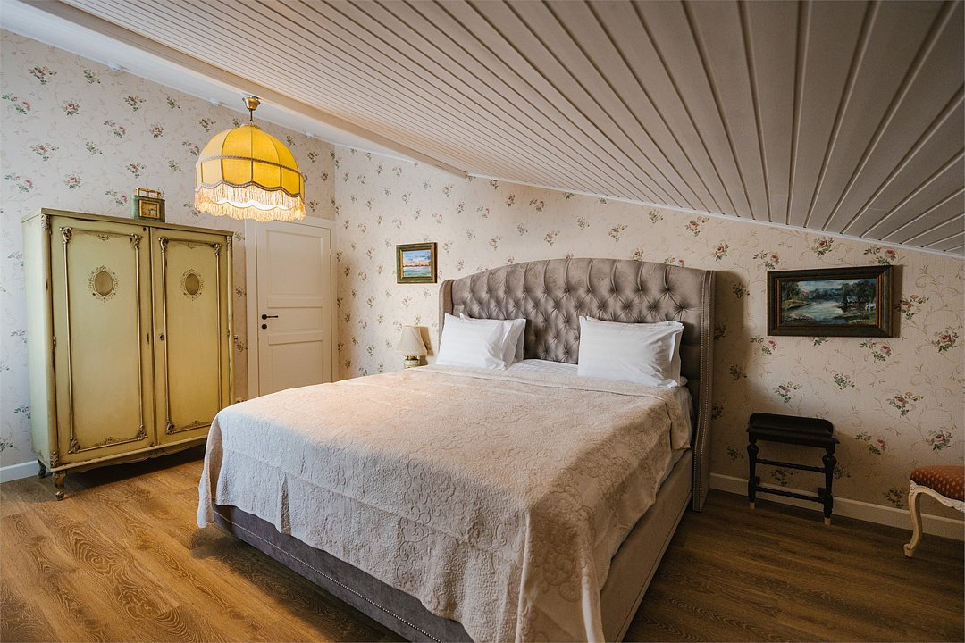 На 32 квадратных метрах пространства мастерски создана атмосфера домашнего уюта и изысканной элегантности. Центральное место в номере занимает великолепная кровать king-size с премиальным матрасом, гарантирующая безмятежный и комфортный сон. Интерьер номера украшен тщательно подобранной антикварной мебелью, которая создает особую атмосферу и погружает в атмосферу загородного дома. Каждая деталь обстановки подчеркивает уникальный характер этого пространства.Услуги и удобства
