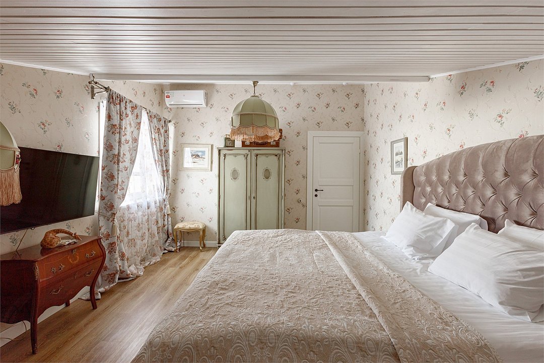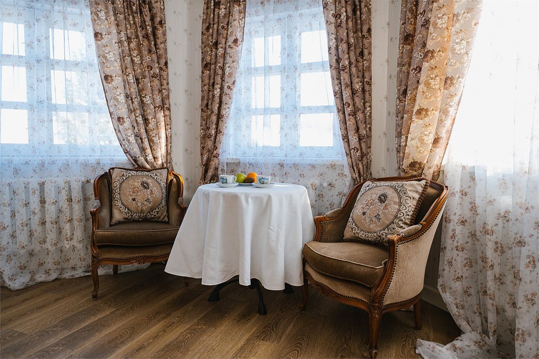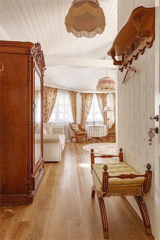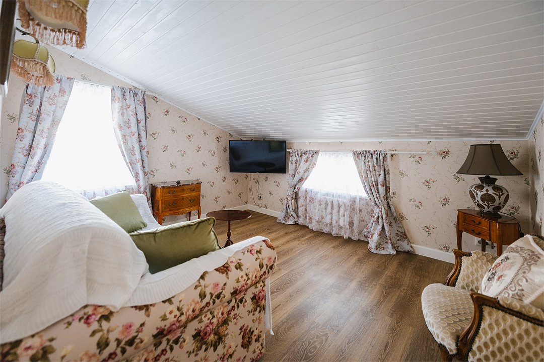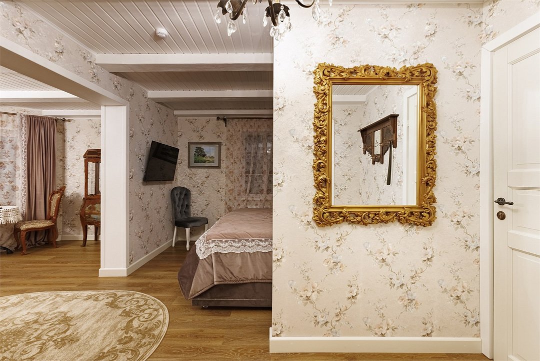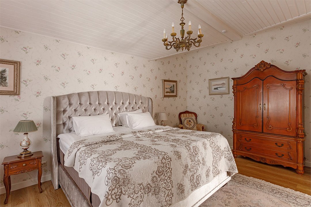 На 32 квадратных метрах пространства мастерски создана атмосфера домашнего уюта и изысканной элегантности. Центральное место в номере занимает великолепная кровать king-size с премиальным матрасом, гарантирующая безмятежный и комфортный сон. Интерьер номера украшен тщательно подобранной антикварной мебелью, которая создает особую атмосферу и погружает в атмосферу загородного дома. Каждая деталь обстановки подчеркивает уникальный характер этого пространства.Услуги и удобства