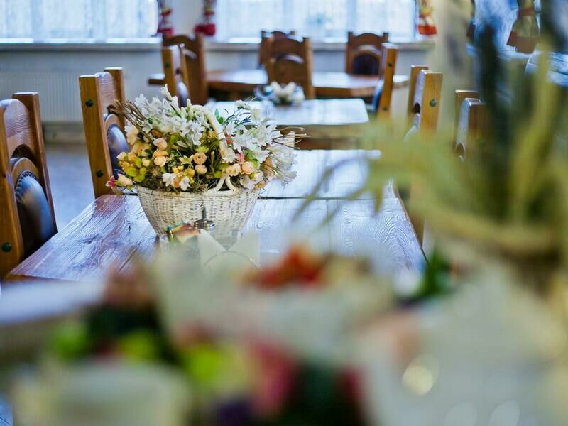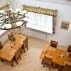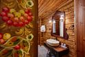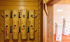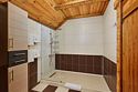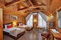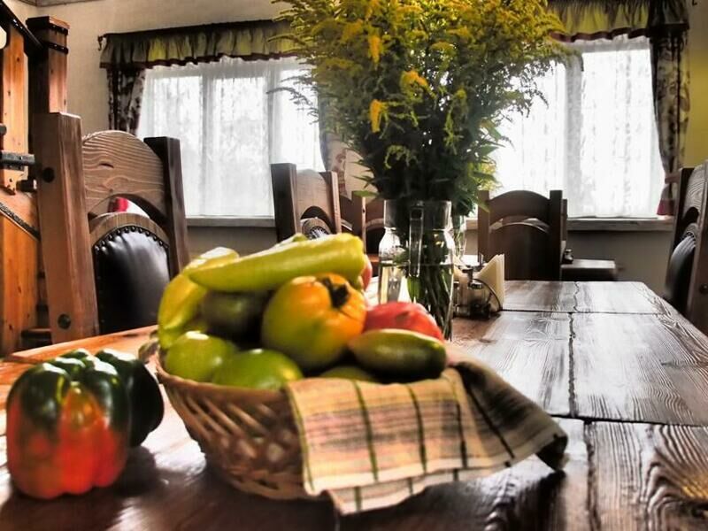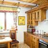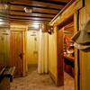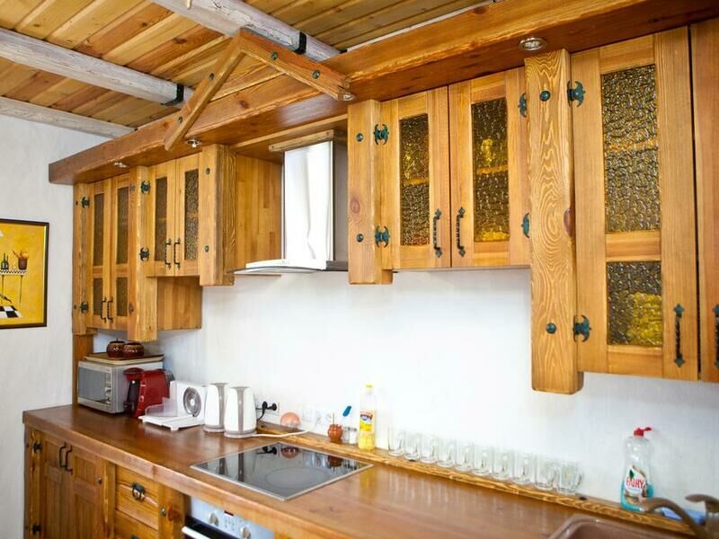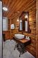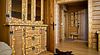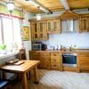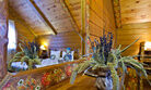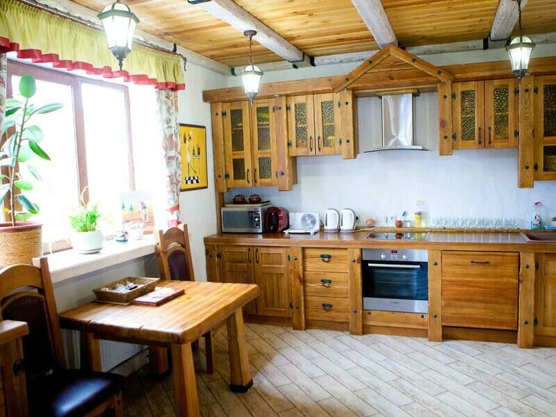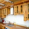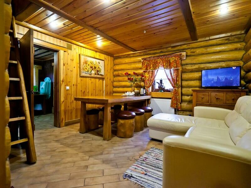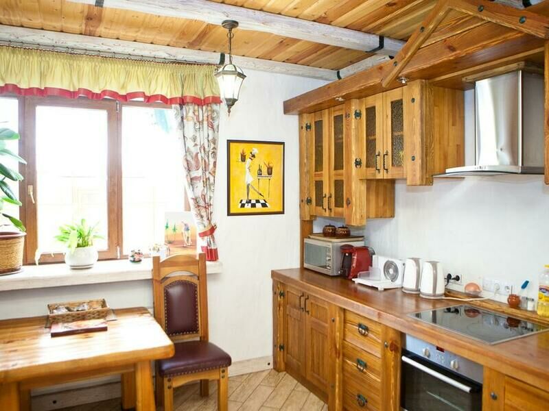 На первом этаже зона лаунджа и оборудованная кухня с СВЧ, электрочайниками, посудой (вода, чай и какао входят в стоимость). Настоящий камин и столовая на 20 человек. Трапезная также оснащена домашним кинотеатром с караоке.