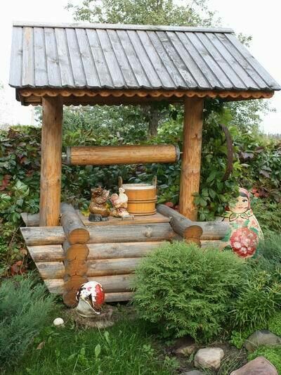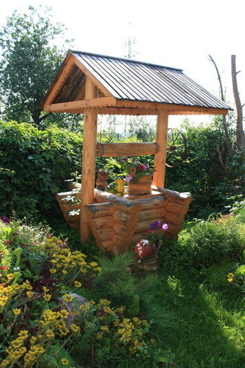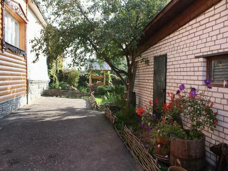 Двор. Во дворе можно найти беседку, в которой очень приятно есть шашлыки. Кроме того здесь много деревьев, колодец, бассейн и даже традиционные славянские сани.