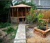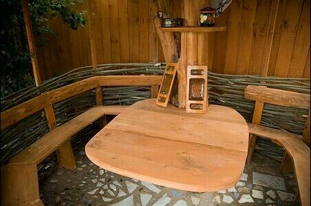 На площадке для отдыха находится крытая беседка, а рядом с ней - печка-барбекю для жарки шашлыка.