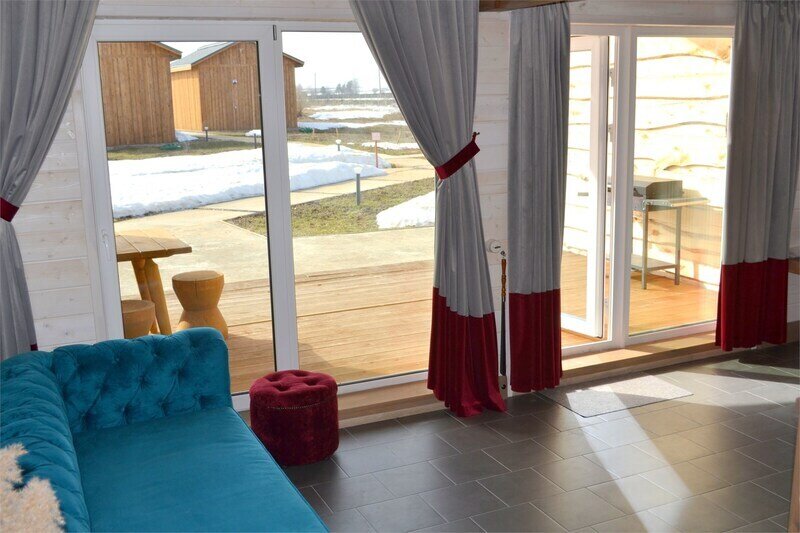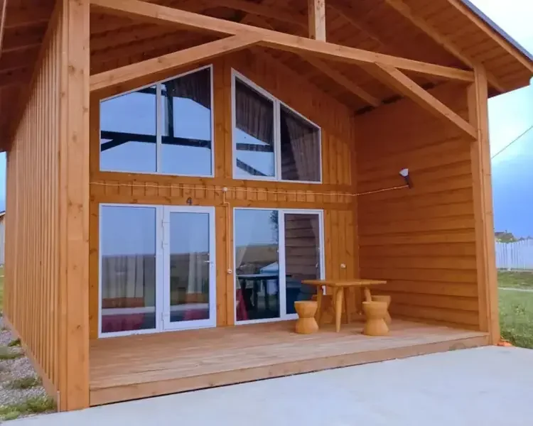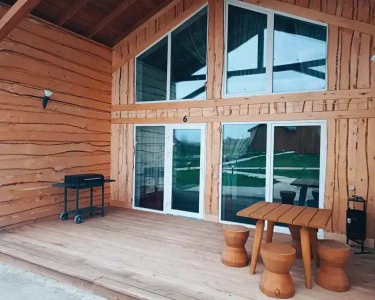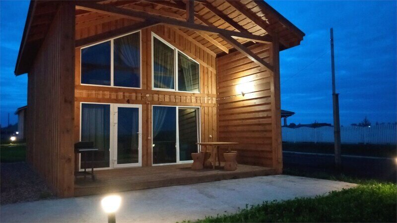 На территории расположены 8 двухэтажных домиков с панорамными окнами, просторной террасой с уличной мебелью и барбекю.