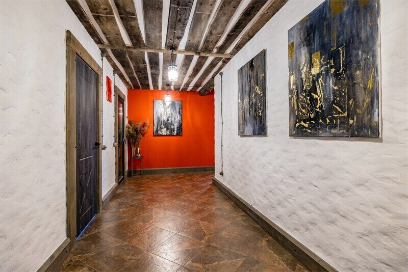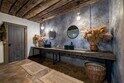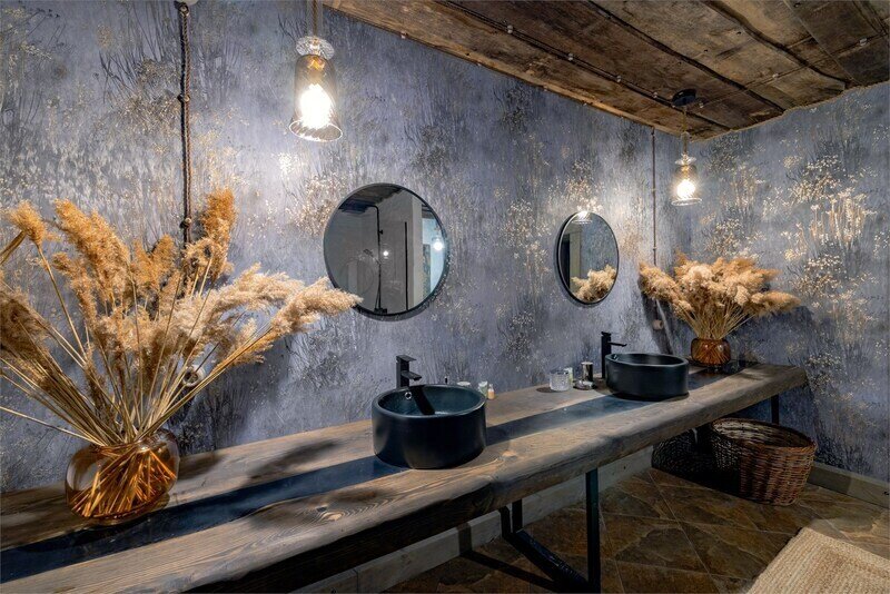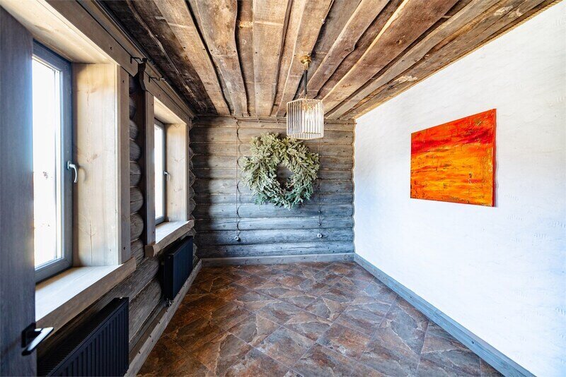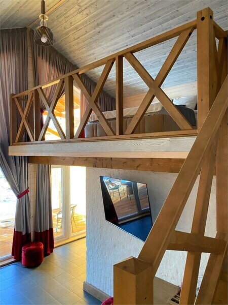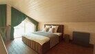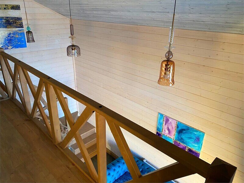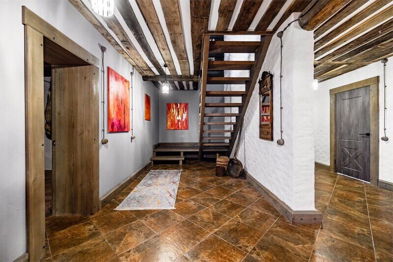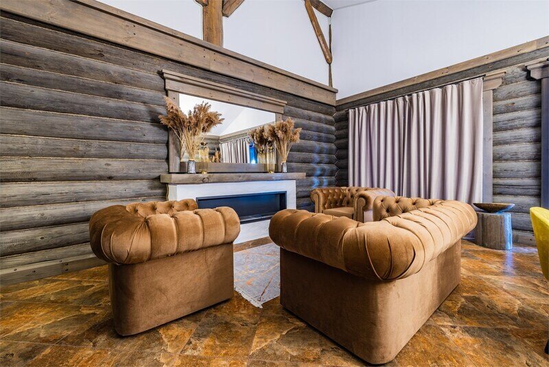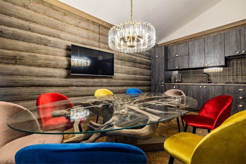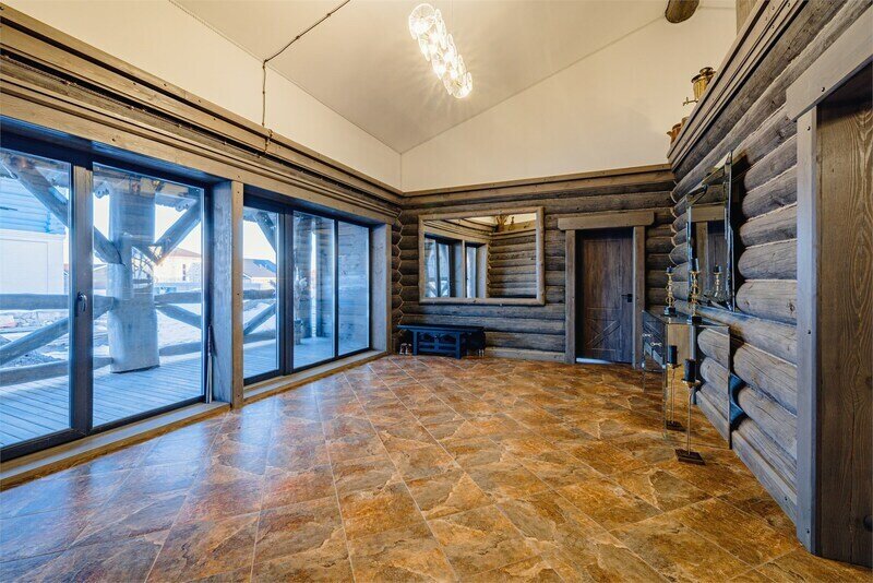 Планировка дома: 1 этаж: холл, каминный зал - столовая зона, спальня (2 места) + гардероб, смежная с этой комнатой спальня детская ( для ребенка до 18 лет + возможность установки спального места в виде детской кроватки), спальня (2 места), спальня ( 2 места) с/у+ терраса 160 кв.метров. 2 этаж (цоколь): холл, кинозал, сауна с чиллаут - комнатой, винная комната/ место для установки холодильника для шуб, 2 спальни по 2 места, гардеробы (гладильная), с/у. Отдельная комната для хранения инвентаря с фасада дома. Мангальная зона. Видеонаблюдение по периметру. У дома два парковочных места. Гостевая стоянка у въезда в поселок. Ухоженный участок с зоной для загара. Частный пляж. Дом олицетворяет собой преемственность лучших традиций, надежность, основательность, качество и премиальный комфорт. Внешняя эффектность, но при этом солидность и основательность – вот главные характеристики этой резиденции, выполненной в стиле шале площадью около 500 кв. метров. Большие панорамные окна в каминном зале наполняют пространство светом и создают ощущение простора, воздушности. У дома патио – терраса, площадью около 160 кв. метров на которую имеется выход из каминного зала с парадной столовой группой, шезлонгами. Приглашенный дизайнер оформила образцово-показательное шале с мебелью ручной работы и современной техникой. Насытила пространство антиквариатом, арт - объектами и авторской живописью, разработала текстильное убранство каждого помещения. Работа над проектом заняла более года. Этот дом — это отличное выражение баланса комфорта и роскоши. Почти вся мебель в интерьере изготовлена по эскизам дизайнера в единственном экземпляре специально для проекта: от обеденного стола из трехсотлетнего корня клена в стилистике Adrian M., где в качестве столешницы для концептуального предмета мебели послужила гладкая пластина из прочного стекла до дубовых крышек сантехники. В интерьере много дерева ценных пород. Помимо деталей, это и потолочные балки, и массивные дверные проёмы, и лестница. Чтобы эффектные деревянные элементы читались и не сливались в общую массу, стены из полубревен в каминном зале искусственно старили, создавали трещины, лессировали специальными пропитками, а другие элементы в доме окрашивались в цвет «тауп» через который мягко просвечивает текстура дерева.