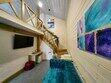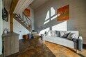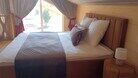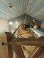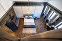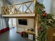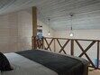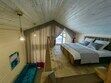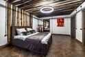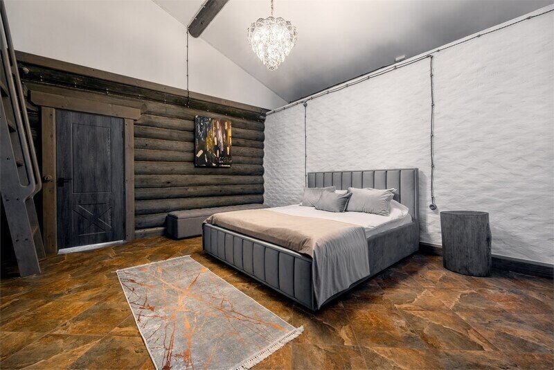 На втором этаже комната оснащена стильной двуспальной кроватью, тумбами и комодом. Авторская живопись на стенах, мебель ручной работы.