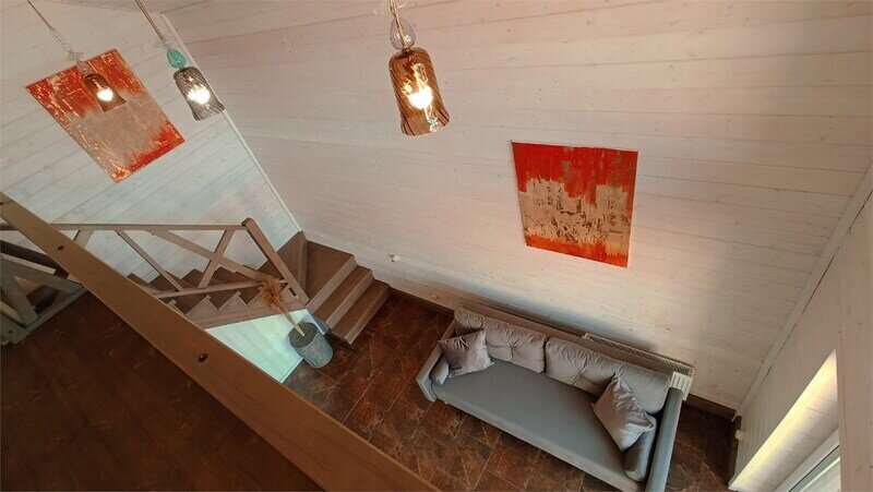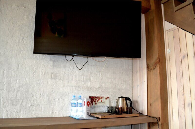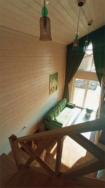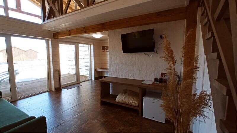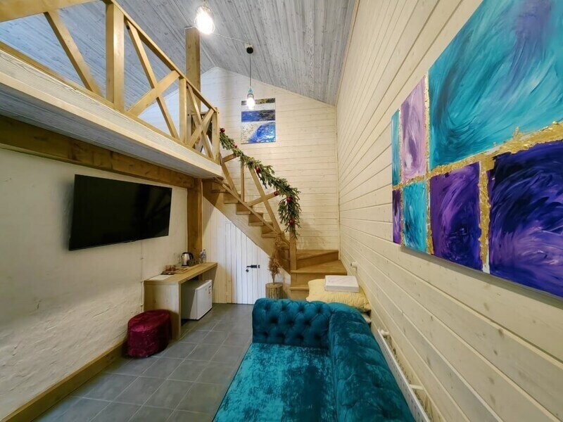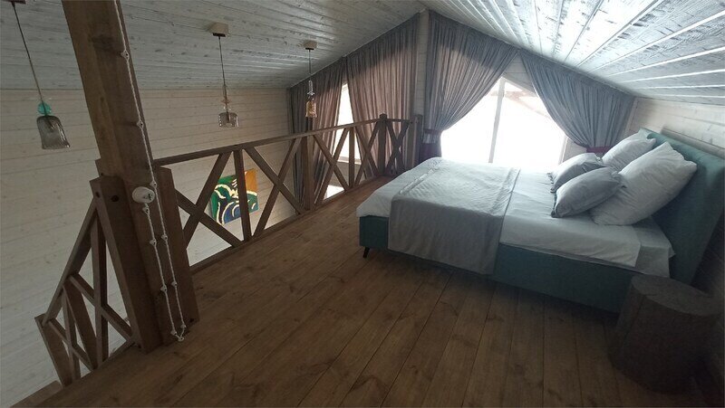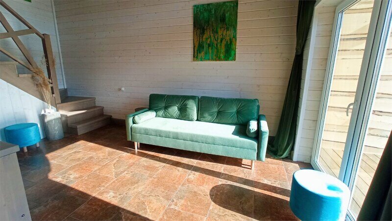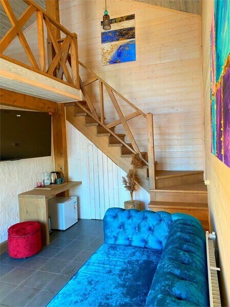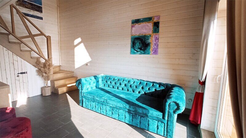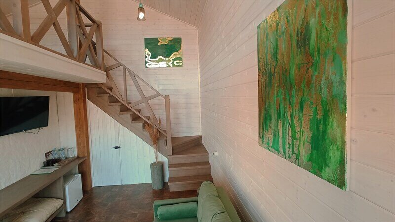 В доме на первом этаже расположены раскладывающийся шикарный диван, два мягких пуфа, телевизор, электрочайник, мини - холодильник, чайная станция, бутилированная вода. Просторная туалетная комната: душ, полотенца, индивидуальные средства гигиены, фен. На втором этаже находится стильная кровать «кинг», 2 прикроватные тумбы, комод. Авторская живопись на стенах, мебель ручной работы.