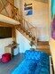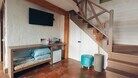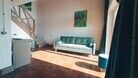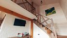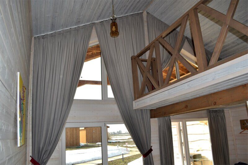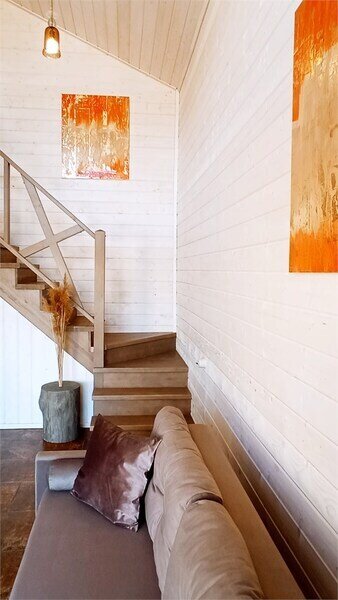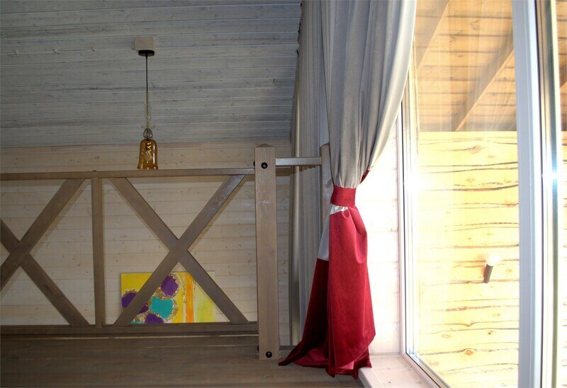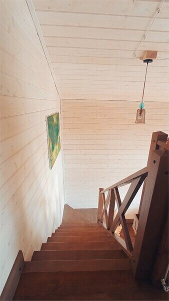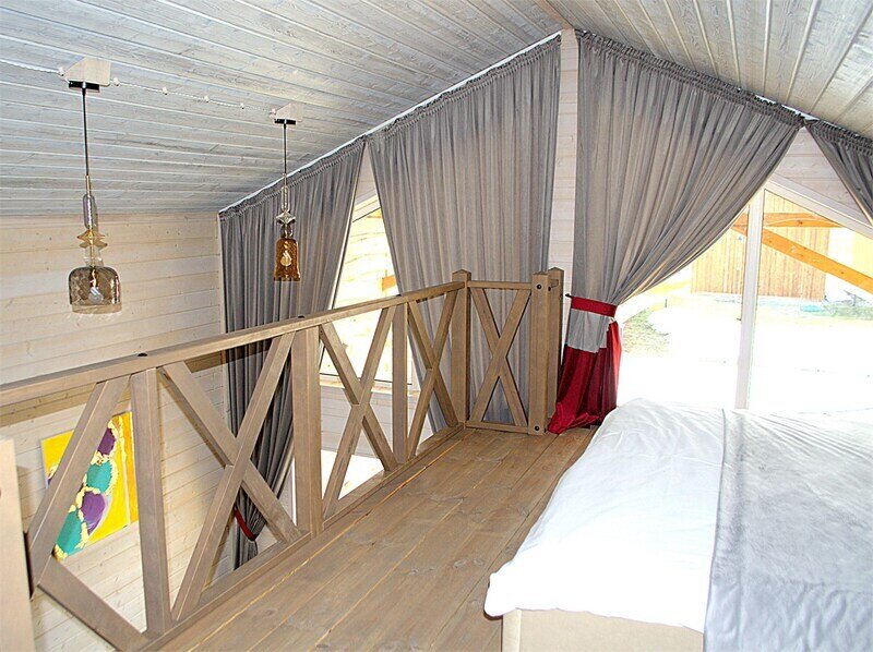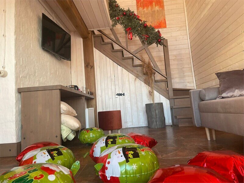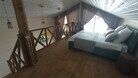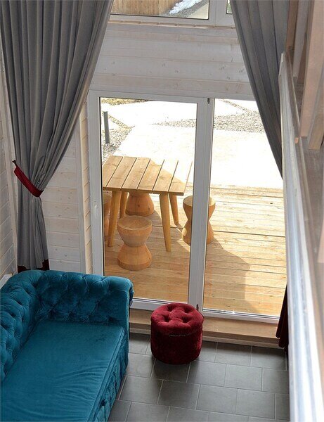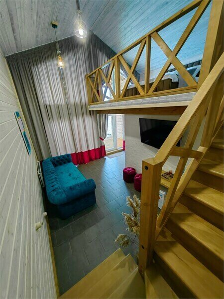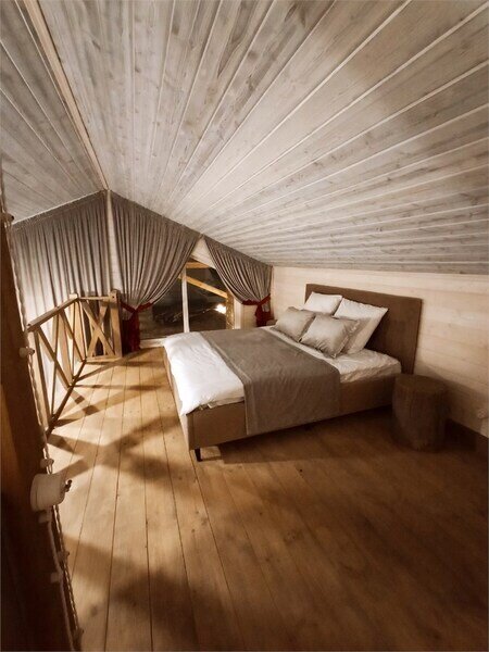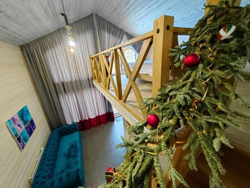 В доме на первом этаже расположены раскладывающийся шикарный диван, два мягких пуфа, телевизор, электрочайник, мини - холодильник, чайная станция, бутилированная вода. Просторная туалетная комната: душ, полотенца, индивидуальные средства гигиены, фен. На втором этаже находится стильная кровать «кинг», 2 прикроватные тумбы, комод. Авторская живопись на стенах, мебель ручной работы.