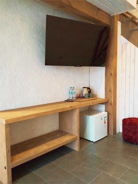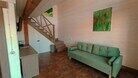 На первом этаже коттеджа находится гостиная с шикарным диваном, ТВ, мини холодильником и чайной станцией, а также, прихожая и туалетная комната.