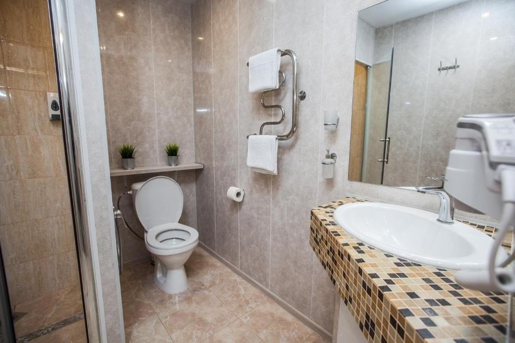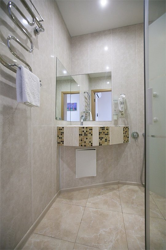 телевизор, кабельное телевидение, Wi-Fi, кондиционер, светильник, фен, система безопасности, утюг, душевая кабина, банные полотенца, гигиенические средства, косметические средства, кровать «King size», вешалки, зеркало, чайный набор, обслуживание номеров, чайник, унитаз, раковина, питьевая вода, отопление, душ, кулер на этаже, вид во двор, ламинат, стаканы, туалетный столик, стул, стол, туалетные средства, туалет, рабочий столВ номере