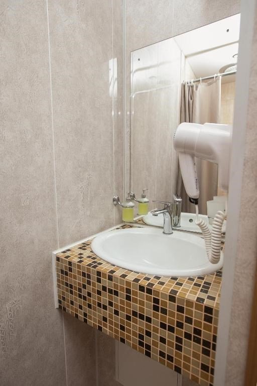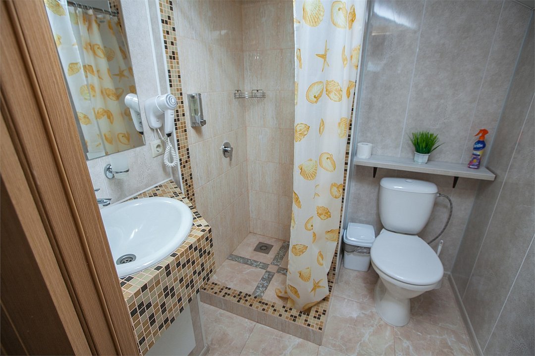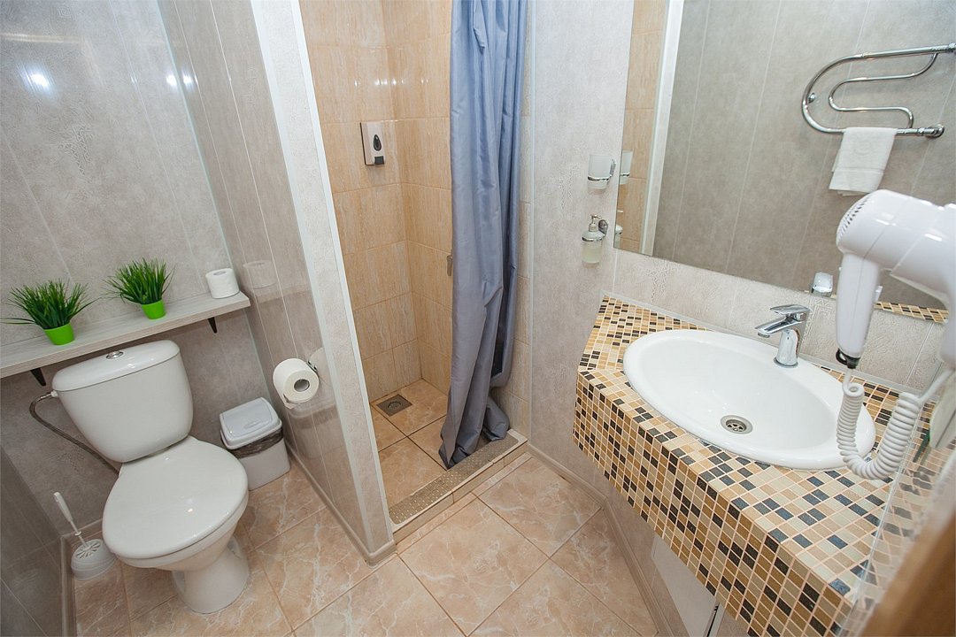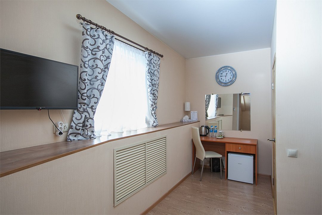 телевизор, кабельное телевидение, Wi-Fi, кондиционер, светильник, фен, система безопасности, утюг, душевая кабина, санузел, гигиенические средства, косметические средства, односпальная кровать, гладильная доска, вешалки, зеркало, чайный набор, обслуживание номеров, чайник, унитаз, питьевая вода, отопление, душ, кулер на этаже, вид во двор, ламинат, стаканы, стул, стол, туалетные средства, туалетВ номере