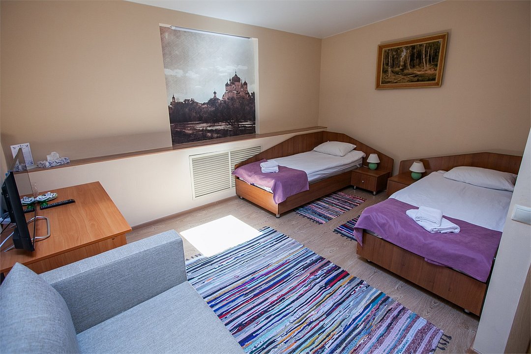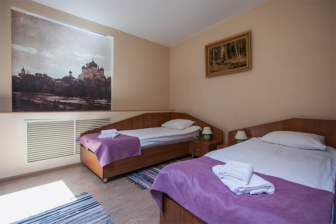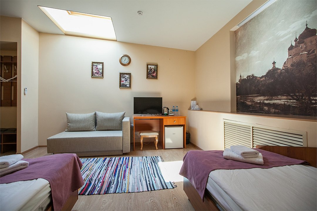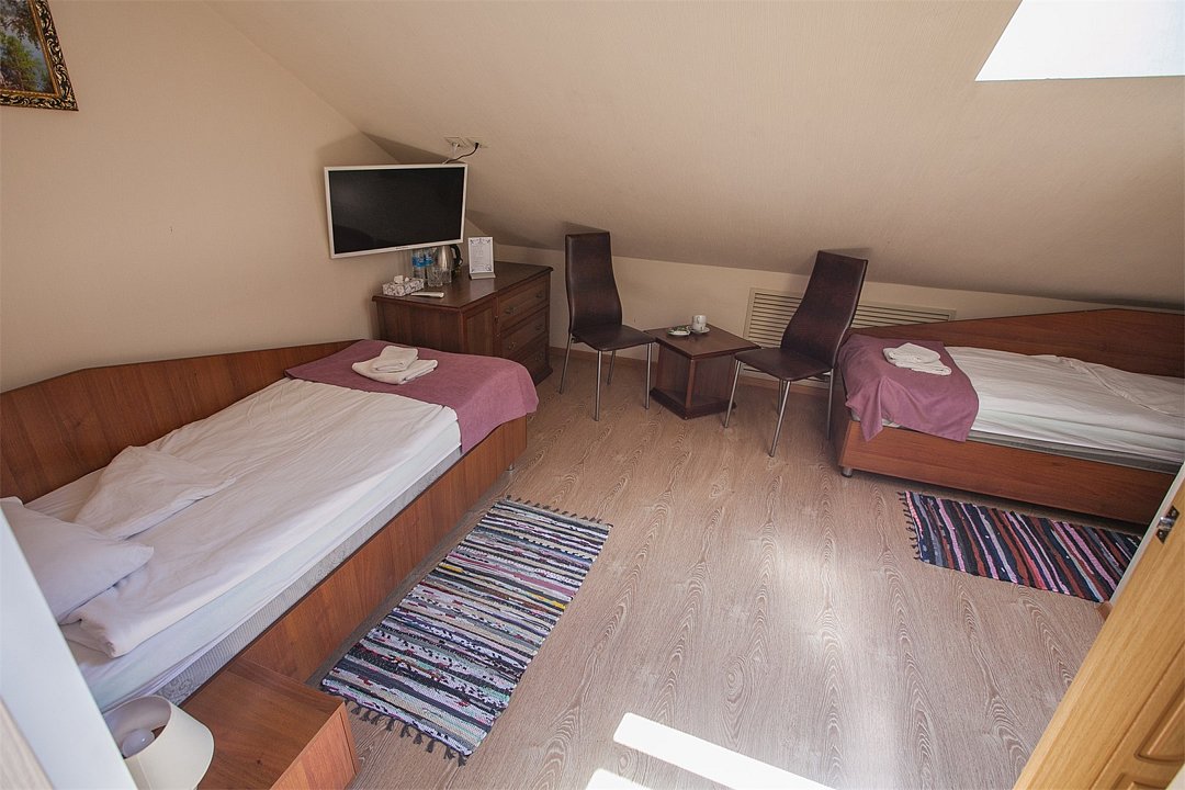 телевизор, кабельное телевидение, Wi-Fi, кондиционер, светильник, фен, система безопасности, утюг, душевая кабина, гигиенические средства, косметические средства, две односпальные кровати, гладильная доска, стулья, вешалки, комод, чайный набор, обслуживание номеров, чайник, унитаз, раковина, питьевая вода, отопление, душ, кулер на этаже, стаканы, туалет, мансардные окнаВ номере