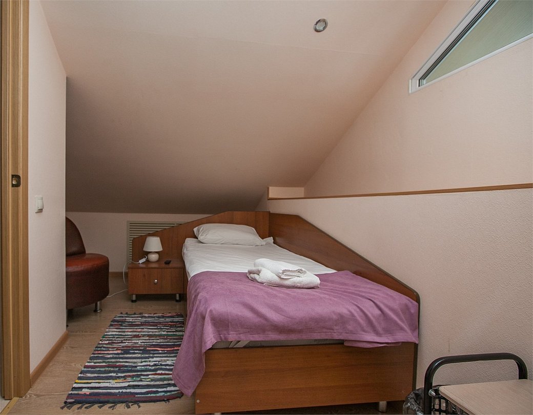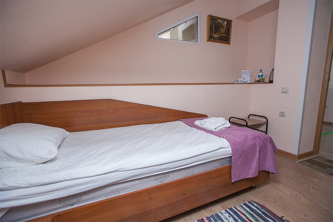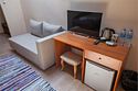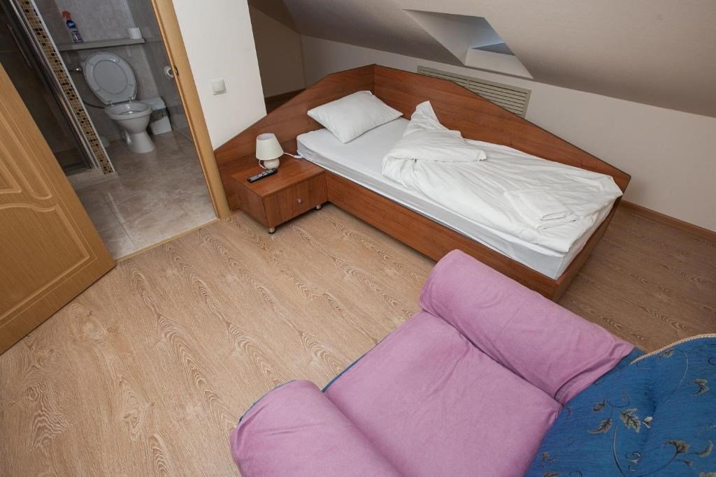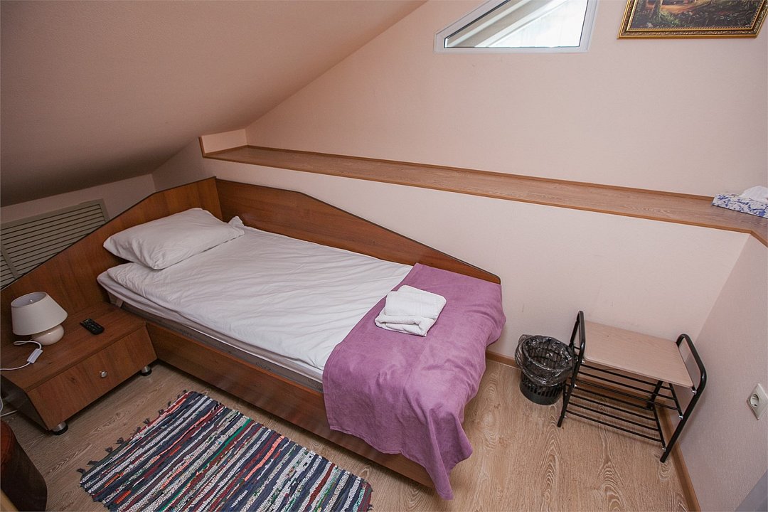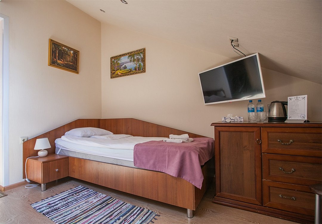 телевизор, кабельное телевидение, Wi-Fi, кондиционер, светильник, фен, система безопасности, утюг, душевая кабина, гигиенические средства, косметические средства, односпальная кровать, кресла, стулья, вешалки, чайный набор, обслуживание номеров, чайник, унитаз, раковина, питьевая вода, отопление, душ, кулер на этаже, ламинат, стаканы, стол, туалет, мансардные окнаВ номере