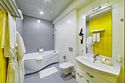 телевизор, Wi-Fi, телефон, светильник, фен, электронные замки, ванная комната, ванна или душевая кабина, теплый пол, банные принадлежности, халаты, банные полотенца, тапочки, гигиенические средства, косметические средства, балкон, балкон с красивым видом, двуспальная кровать, диван, тумбы, стулья, шкаф для одежды, вешалки, письменный стол, зеркало, мини-бар, чайный набор, набор посуды, обслуживание номеров, сейф, чайник, питьевая вода, отдельный вход в номер, вид на город, стаканы, мини-холодильник, теплые полы, без питомцевВ номере