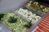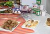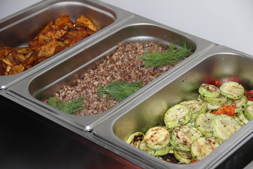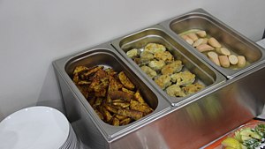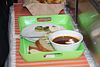 Чайник, чайная пара, два пакетика черного чая и столько же зеленого, сахар в пакетиках. Все пополняется.