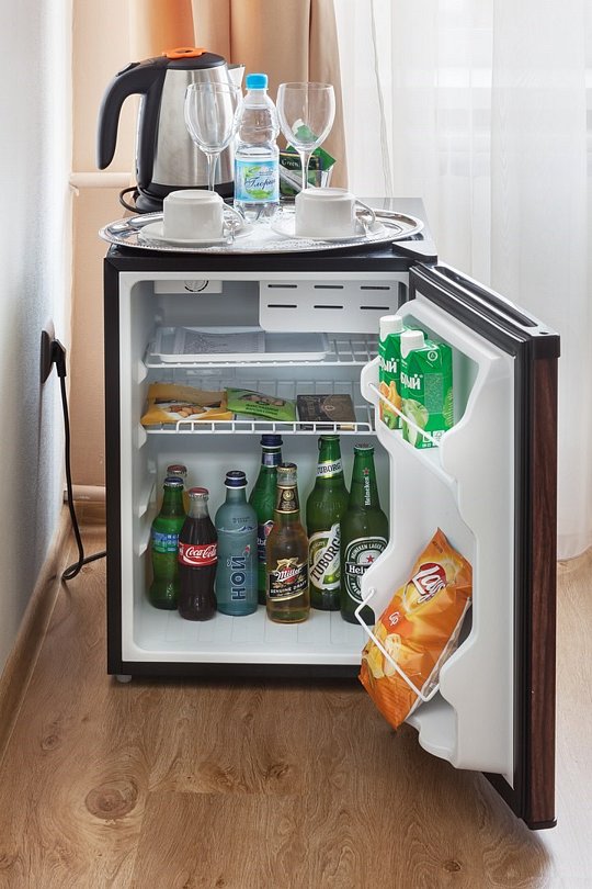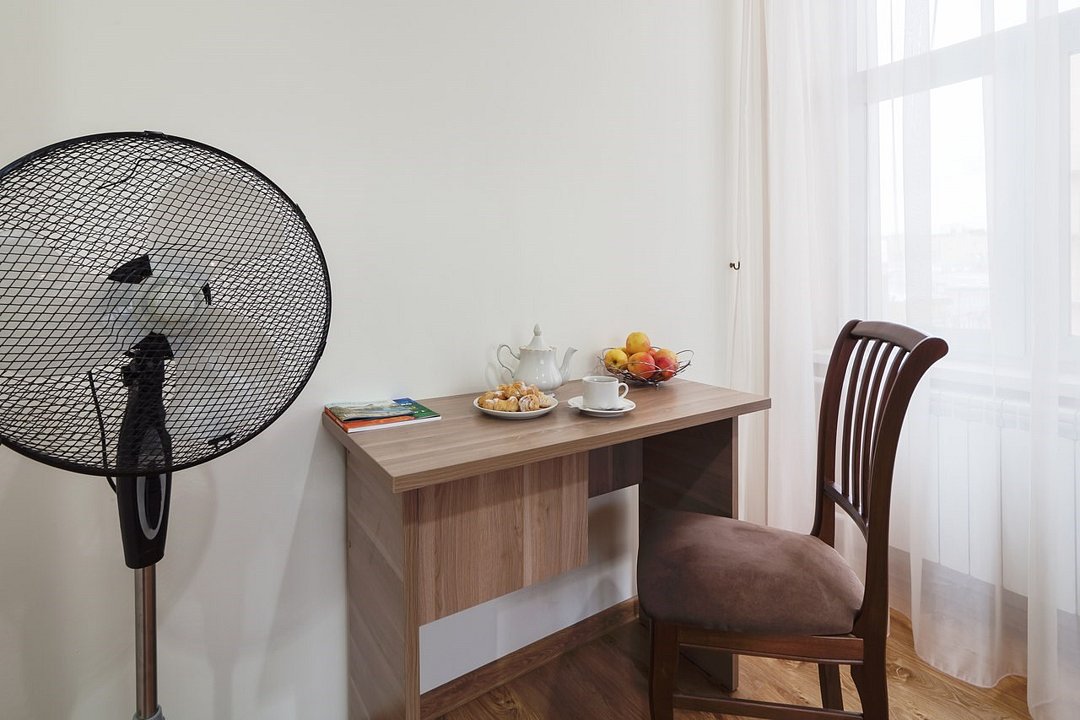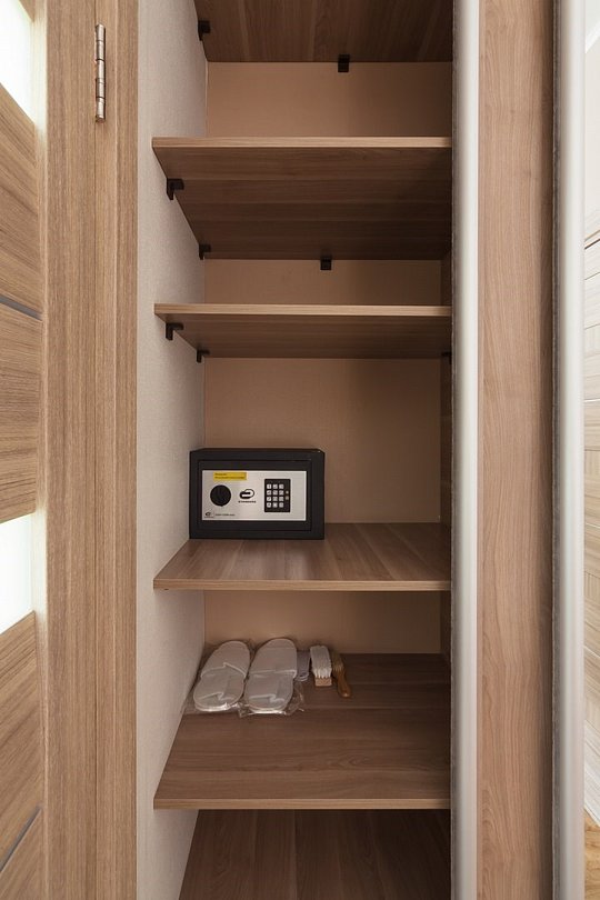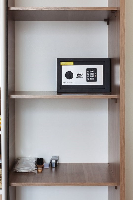 В номере был кондиционер. Предлагали при заселении два номера одноместных (на втором и третьем этажах) - на втором этаже номер, сказали, меньше размером и с вентилятором, я выбрала на третьем этаже чуть побольше и с кондиционером. Но кондиционер, тоже недавно установлен, видно, т.к. на фото номеров отеля в "моем" номере стоял вентилятор, а на деле оказался кондей. И в номере был сейф и обогреватель "ветерок" в шкафу. В шкафу же было 6 плечиков, в том числе два плечика с прищепками для брюк, НО ода прищепка для брюк была сломана. Но я всегда из дома беру свои вешалки для брюк, так что мои брючки не страдают без отсутствия таких вешалок.В шкафу пара тапочек и ложка и щетка для обуви.