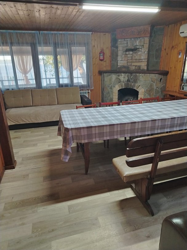 Большой вместительный коттедж, включающий шесть спальные комнаты и гостиную. Дом оборудован всем необходимым для комфортного проживания и отдыха компании. Рядом находится беседка.