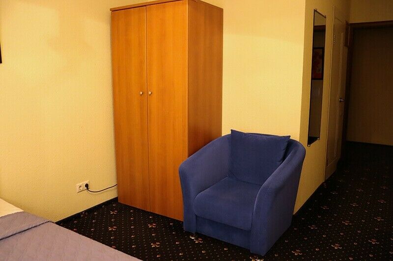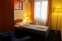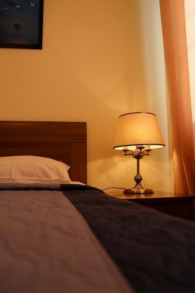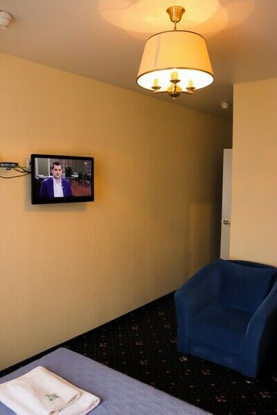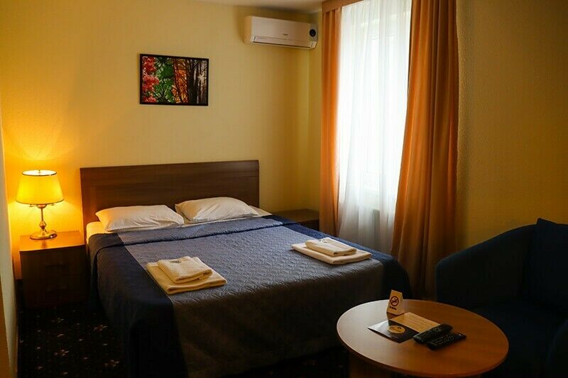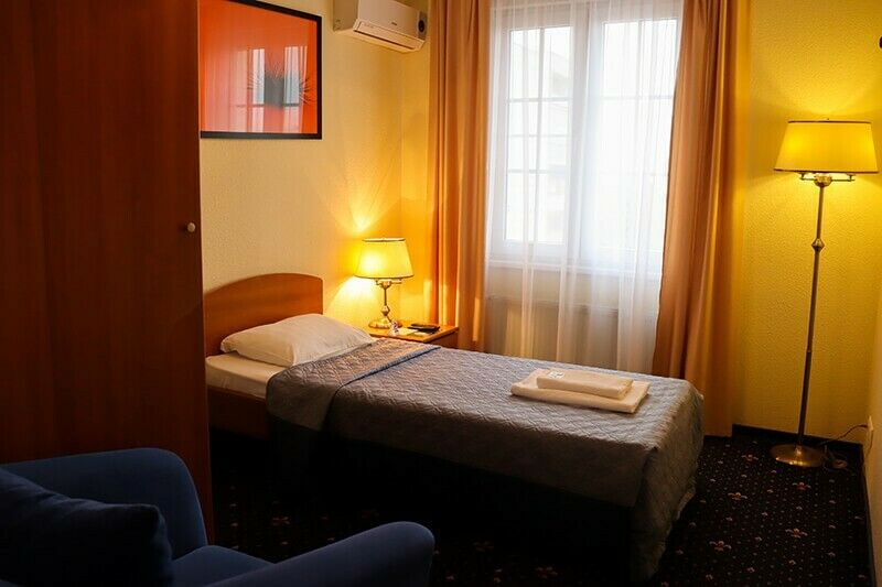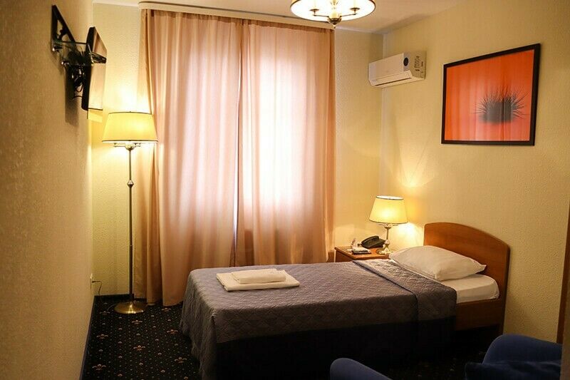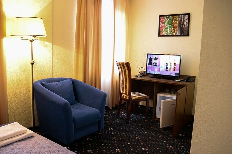 В номере односпальная кровать, шифоньер, прикроватная тумбочка, кресло, TV, мини-бар, торшер, настольная лампа, сплит-система, телефон.