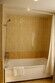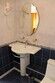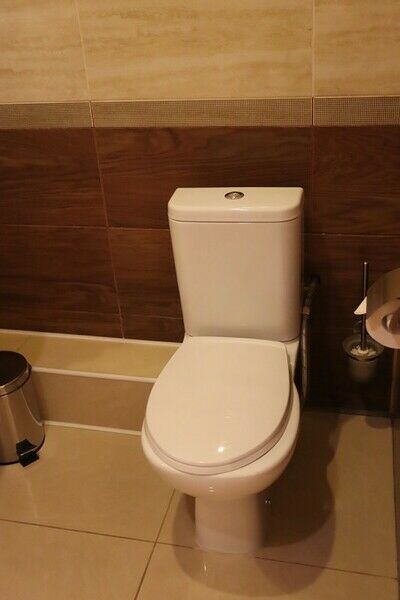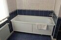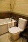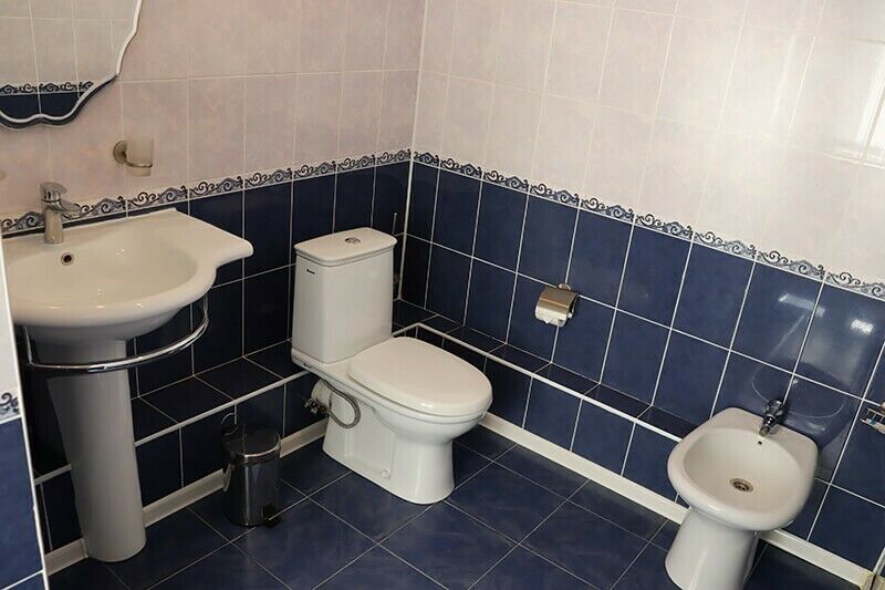 В ванной: ванна, унитаз, биде, раковина, фен, коврик для ног.