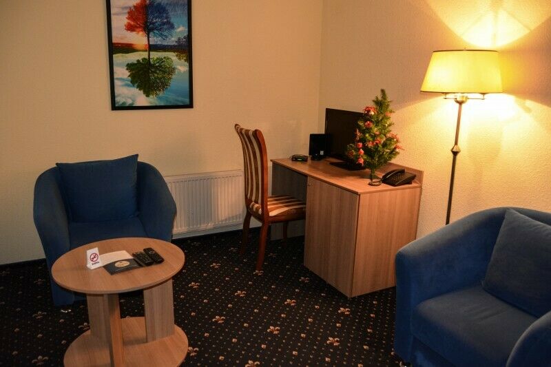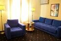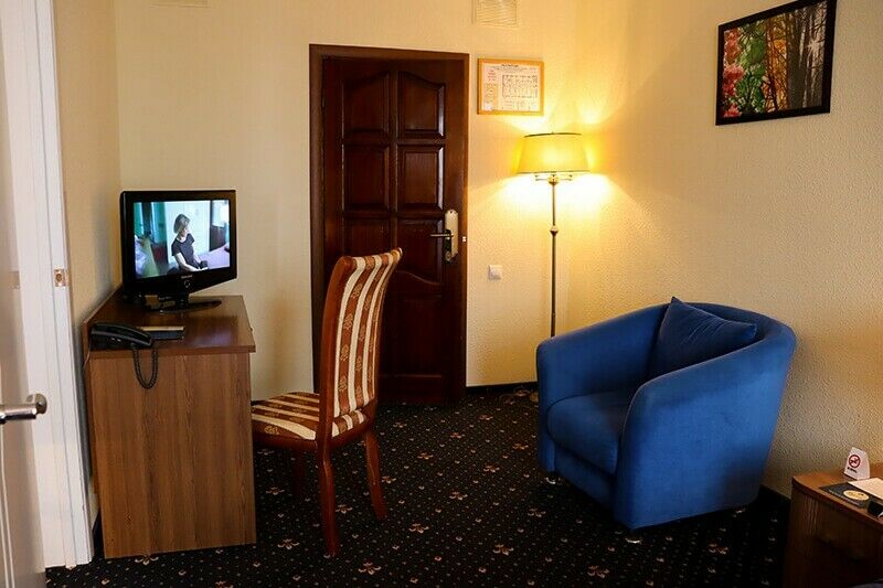 В номере двуспальная кровать, шифоньер, прикроватные тумбочки, письменный стол, журнальный столик, стул, два кресла, TV, мини-бар, торшер, настольные лампы, сплит-система, телефон.