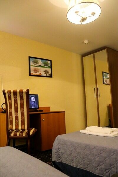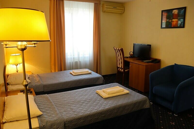 В номере две односпальные кровати, шифоньер, стол для сумок, прикроватные тумбочки, письменный стол, стул, кресло, TV, мини-бар, торшер, настольные лампы, сплит-система, телефон.