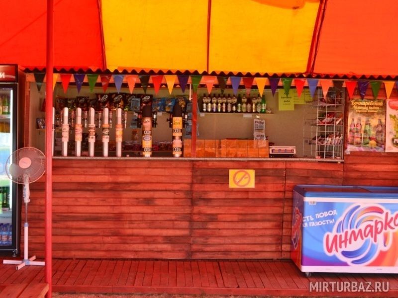 Рядом с территорией пляжа находится бар в шатре и сувенирный магазин.
