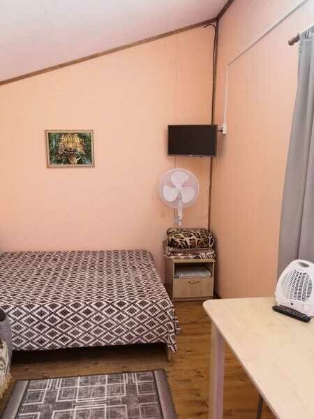Туалет, раковина, телевизор, кровать 2-х спальная, диван, постельные принадлежности, холодильник, микроволновая печь, чайник, вентилятор, доп. стол на мансарде.