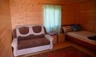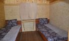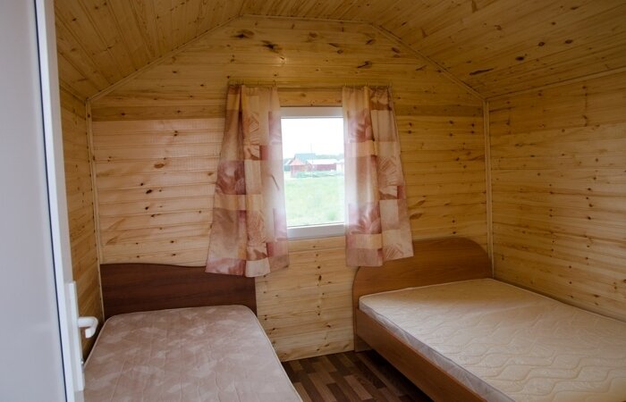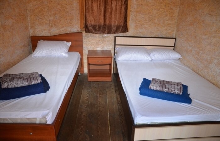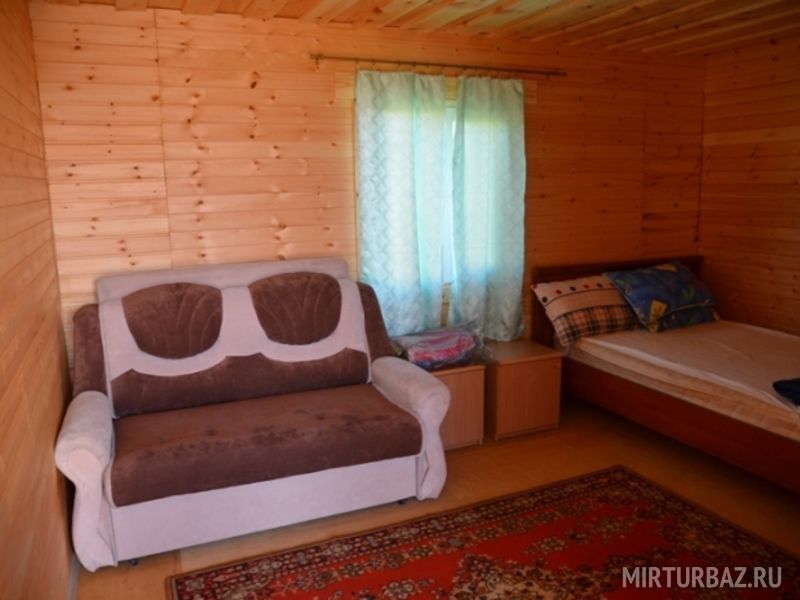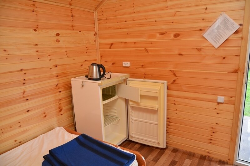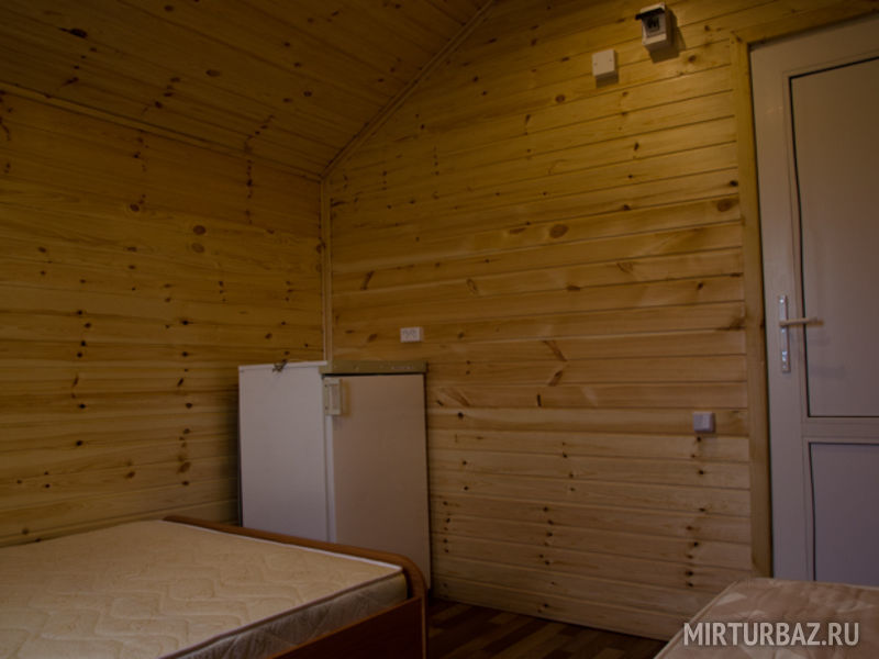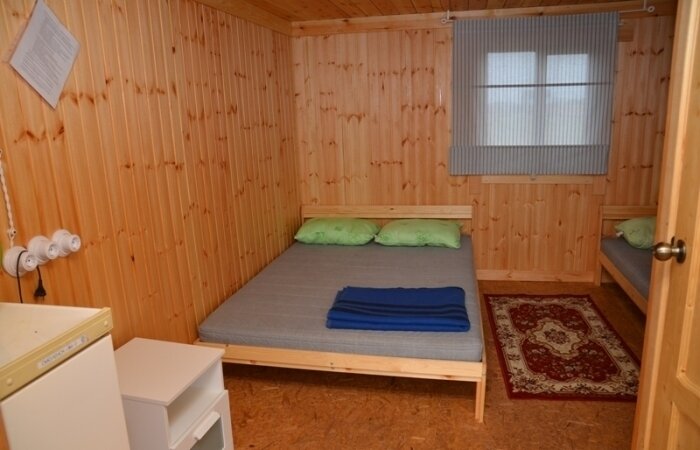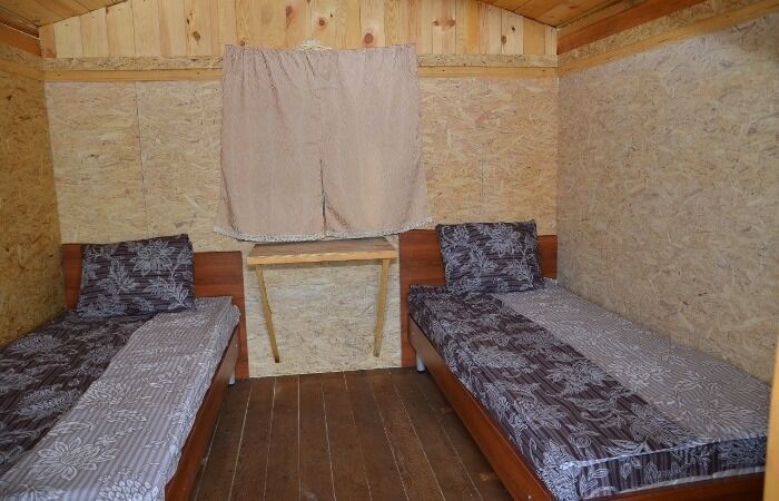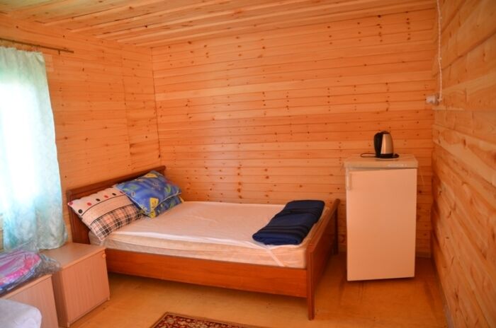 Двухъярусная кровать (низ 1,5 местное , верх 1 местное) и 1-местная кровать. Нижние места с пружинными матрацами, холодильник высотой 1.2 м., чайник, вешалка, розетки, постельное белье, одеяло, подушки. Стол и лавочки. Мангал на два домика. Душ и туалет благоустроенный на территории.