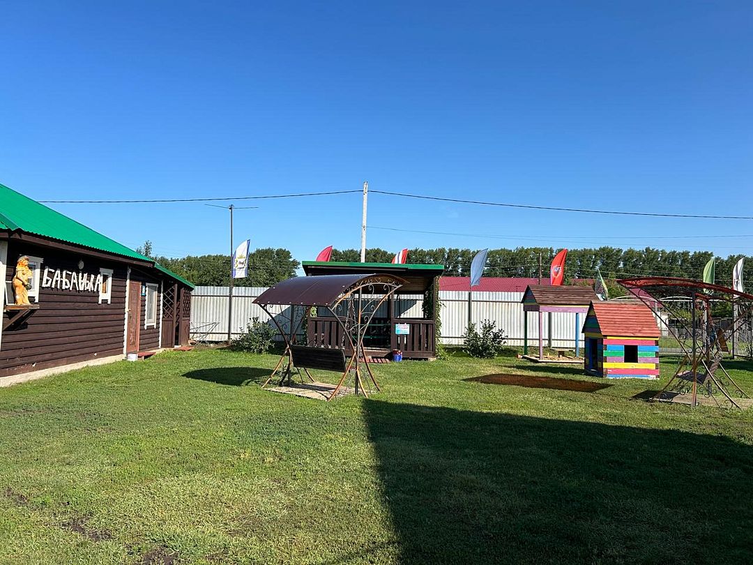 Недалеко от озер, пешком минут 10, на машине менее 5. Огороженная территория. Детская площадка, баня, мангал, лавочки, качели (очень крепкие, с моими 150+ кг. это важно). Удобные кровати и подушки, шея не болит. Домики удобные. мы очень довольны. По цене все устроило.
