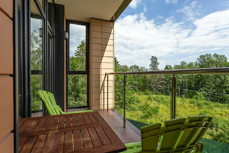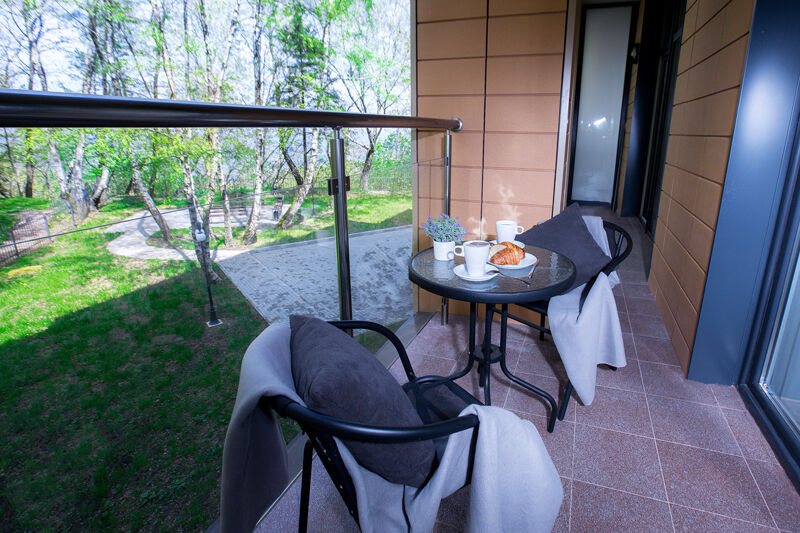 Огромнейшим преимуществом апартаментов является панорамное остекление с видом на березовую рощу и Балтийское море. Большая лоджия с ротанговой мебелью - столик и два кресла с теплыми мягкими пледами, где можно под бокальчик вина насладиться закатом и прекрасным видом.