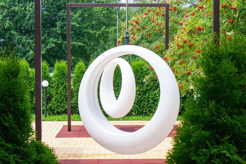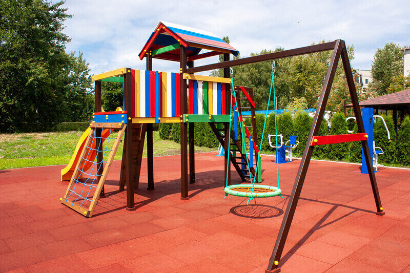 Парклет с уличным мангалом, скамейками и освещенными качелями; прекрасно оборудованная детская площадка и уличные тренажеры.
