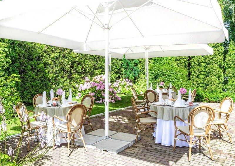 Помимо закрытых пространств есть несколько площадок на свежем воздухе — летнее кафе в тихом дворике ресторана и терраса в виде шатра.