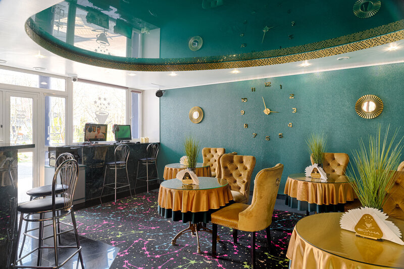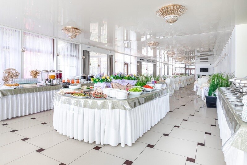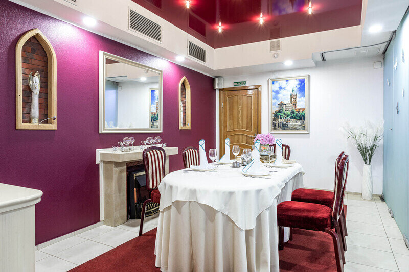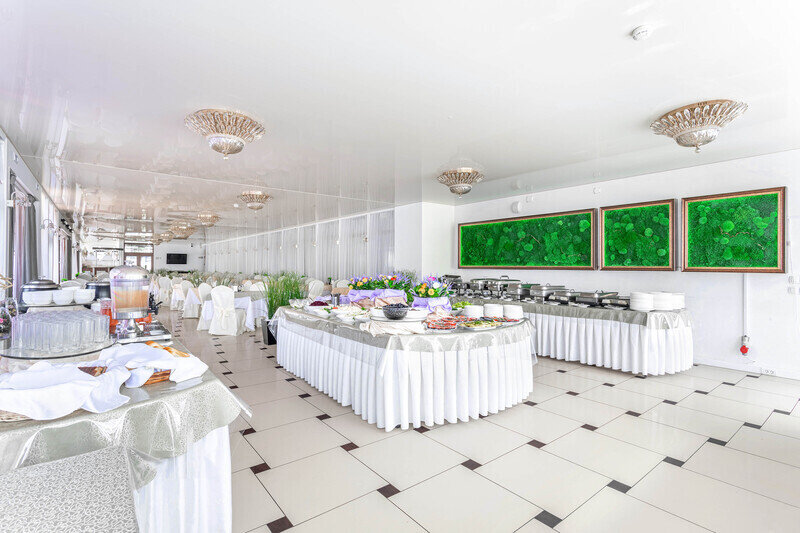 Вкусная кухня и уютная атмосфера. Есть белый зал, который рассчитан на 80 посадочных мест, а вот на фуршет там могут собраться более 100 человек. Также есть залы: синий на 80 мест, красный — 30 человек и банкетный зал, в котором размещаются около 30 персон. А отдохнуть в кругу друзей у камина можно в каминном зале ресторана «Волна» — компанию в нем вам смогут составить до 10 человек.
