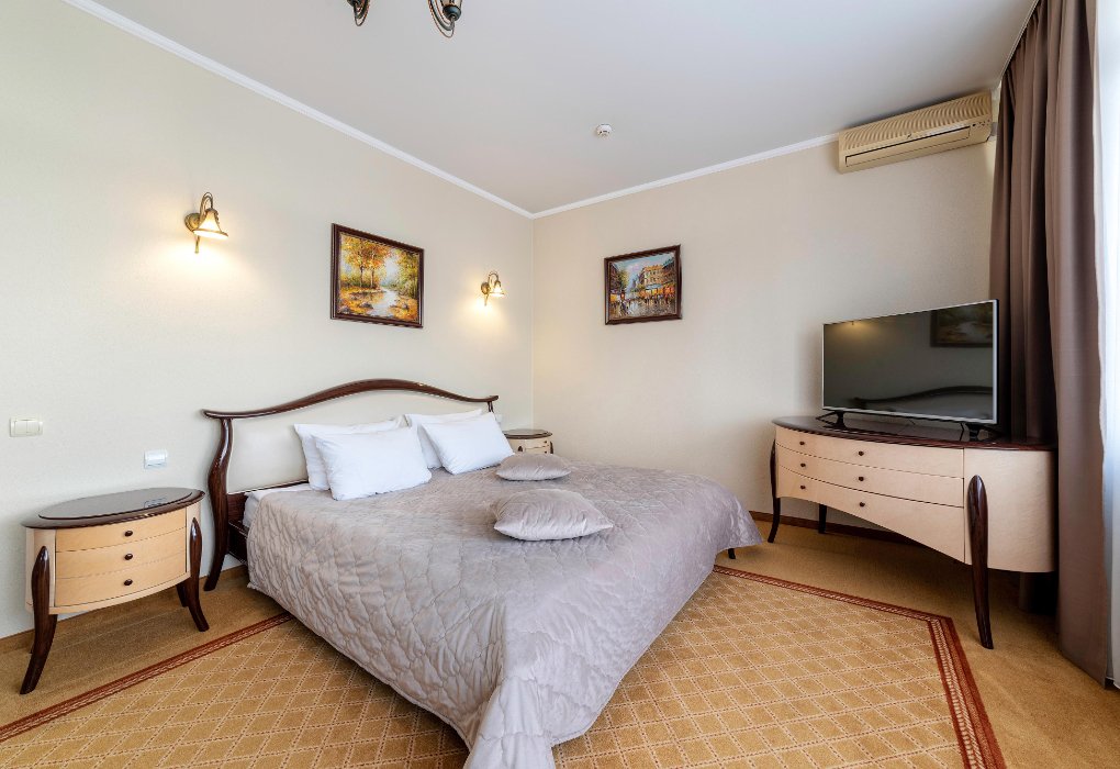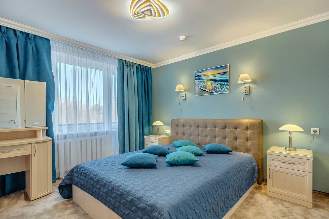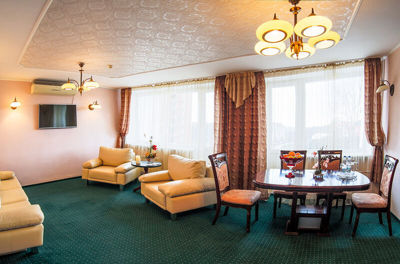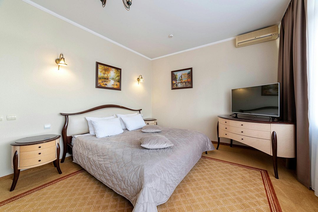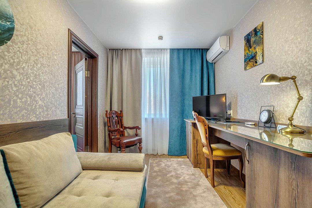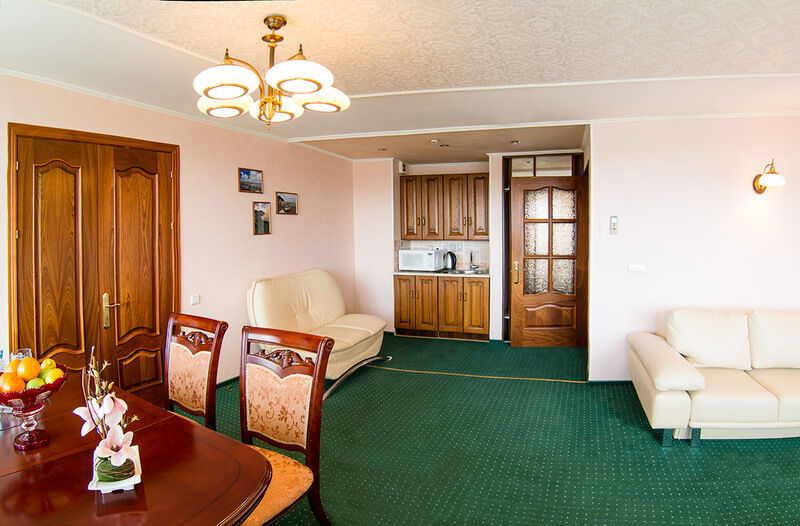 Трехкомнатный номер, состоящий из гостиной с встроенной кухней, кабинета и спальни. В этом номере замечательно отдыхать всей семьей. В номере - два санузла, балкон.