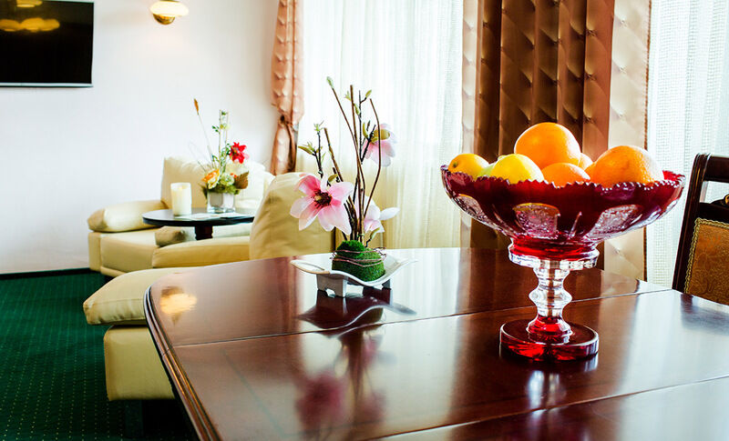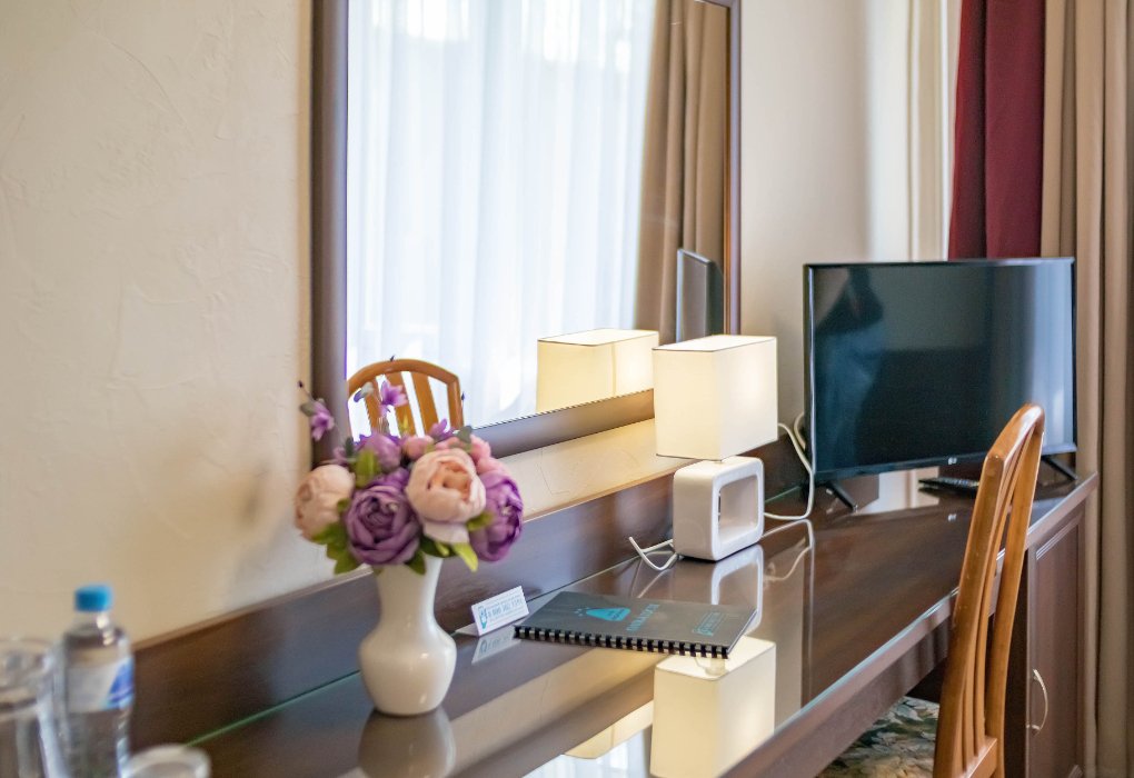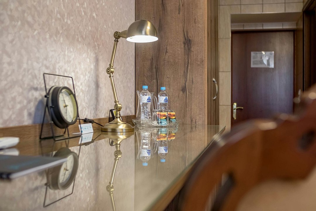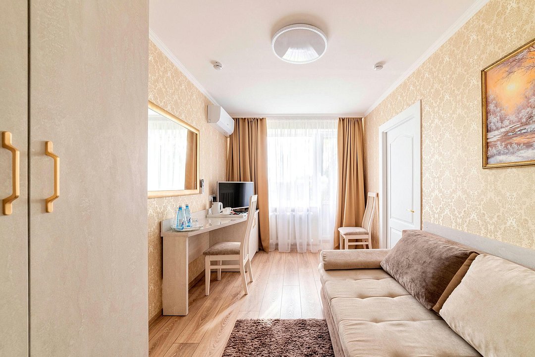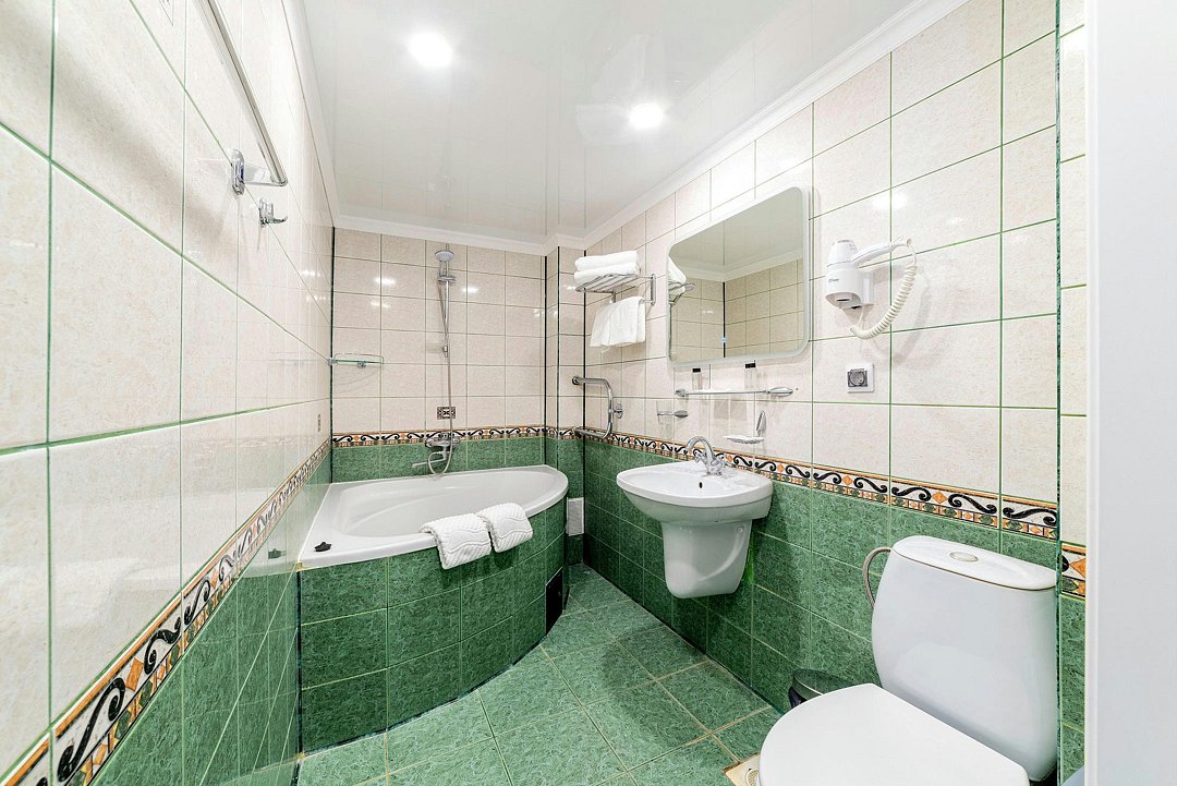 Трехкомнатный номер, состоящий из гостиной с встроенной кухней, кабинета и спальни. В этом номере замечательно отдыхать всей семьей. В номере - два санузла, балкон.
