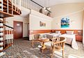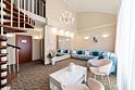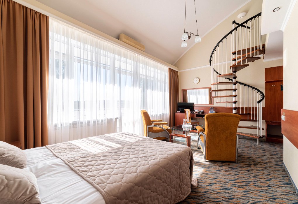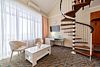 Просторный светлый двухуровневый номер с балконом. Гостиная и спальная комнаты расположены на разных уровнях. Идеальный вариант для семьи из 3-4 человек.